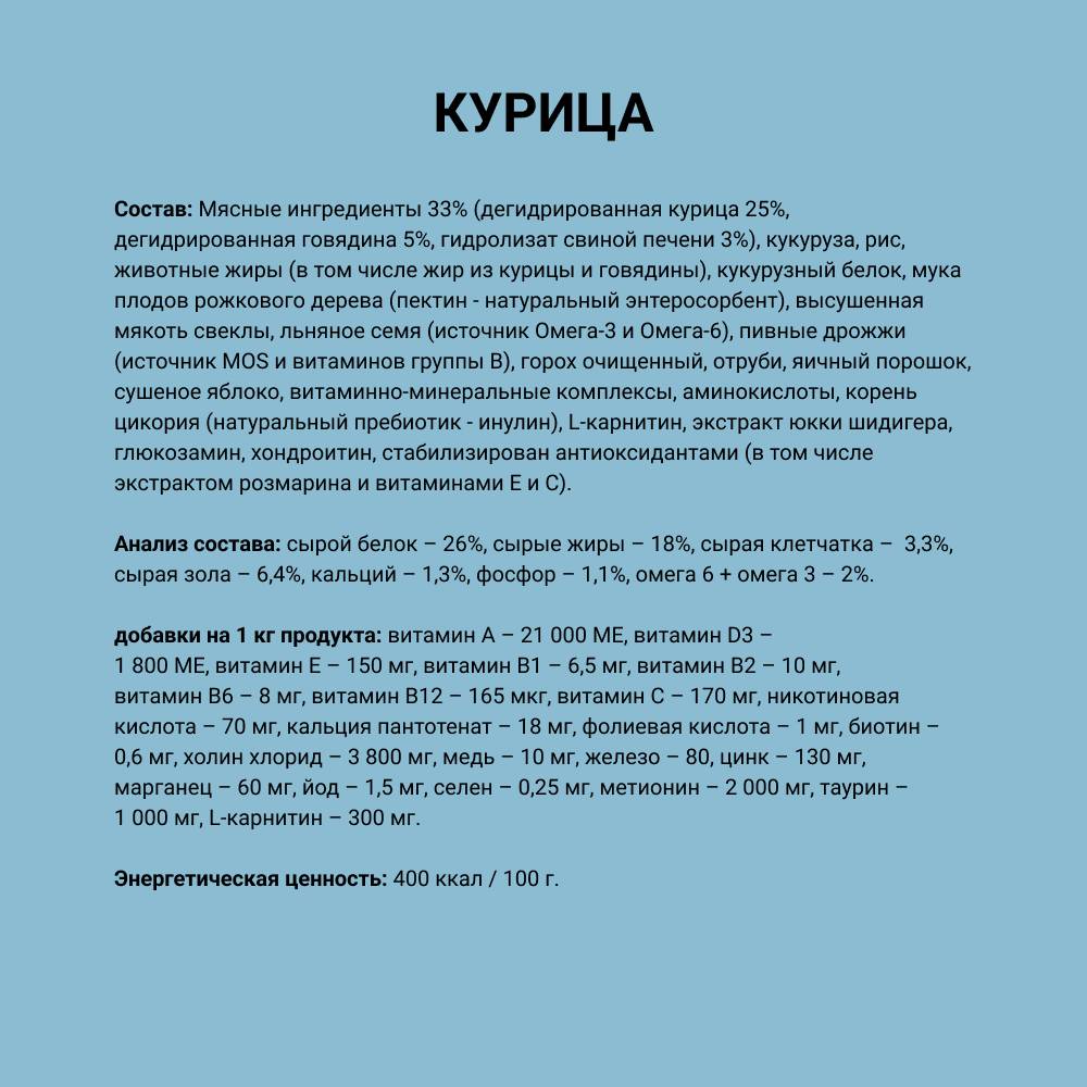 - Здоровье кожи и шерсти питомца обеспечивается благодаря содержанию в составе корма полезных жирных кислот Омега-3 и Омега-6.