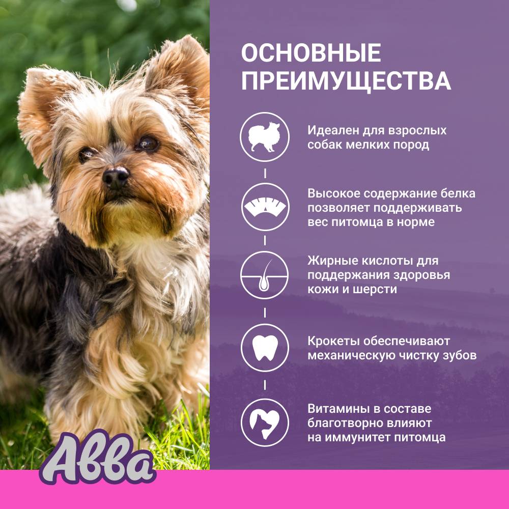 АВВА Premium Small Adult Курица – это полнорационный корм для взрослых собак мелких пород. Сбалансирован по количеству жиров и протеинов и учитывает особенности развития собак мелких пород, предупреждая набор лишнего веса. Небольшой размер гранул для удобного разгрызания. Улучшенный состав без пшеницы.