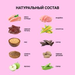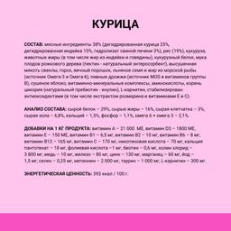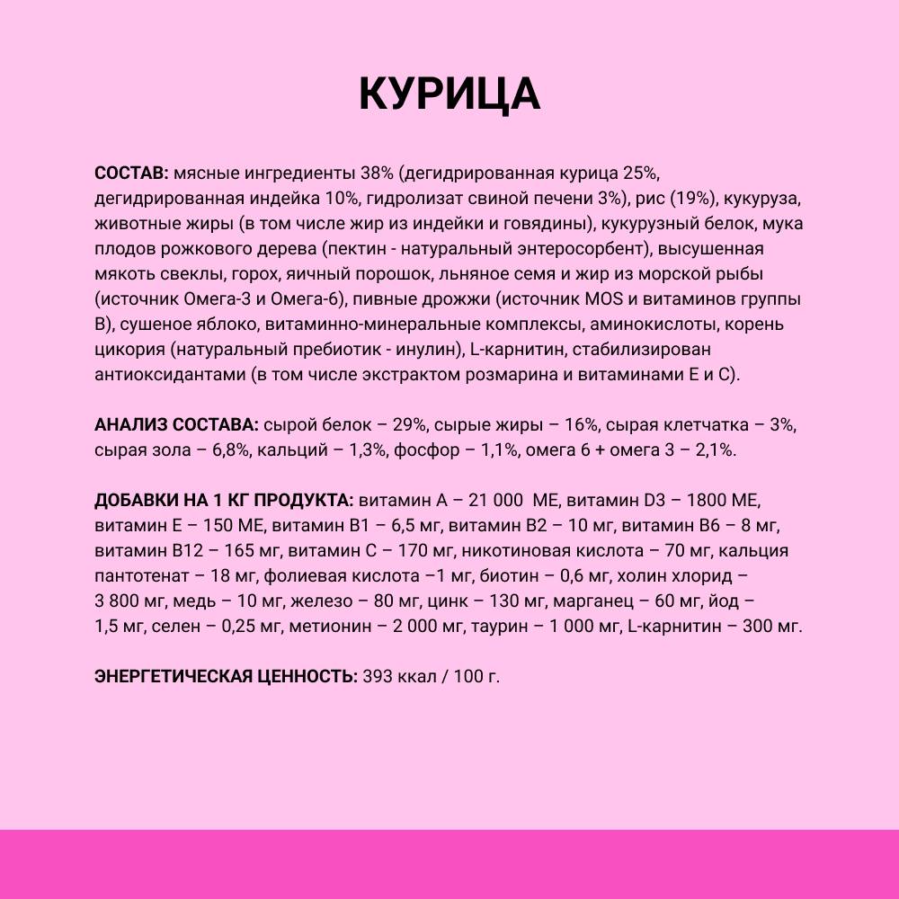 мясные ингредиенты 38% (дегидрированная курица 25%, дегидрированная индейка 10%, гидролизат свиной печени 3%), рис (19%), кукуруза, животные жиры (в том числе жир из индейки и говядины), кукурузный белок, мука плодов рожкового дерева (пектин - натуральный энтеросорбент), высушенная мякоть свеклы, горох, яичный порошок, льняное семя и жир из морской рыбы (источник Омега-3 и Омега-6), пивные дрожжи (источник MOS и витаминов группы B), сушеное яблоко, витаминно-минеральные комплексы, аминокислоты, корень цикория (натуральный пребиотик - инулин), L-карнитин, стабилизирован антиоксидантами (в том числе экстрактом розмарина и витаминами Е и С).