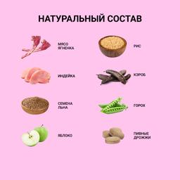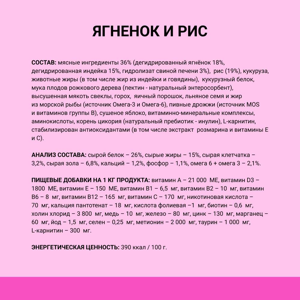 мясные ингредиенты 36% (дегидрированный ягнёнок 18%, дегидрированная индейка 15%, гидролизат свиной печени 3%), рис (19%), кукуруза, животные жиры (в том числе жир из индейки и говядины), кукурузный белок, мука плодов рожкового дерева (пектин - натуральный энтеросорбент), высушенная мякоть свеклы, горох, яичный порошок, льняное семя и жир из морской рыбы (источник Омега-3 и Омега-6), пивные дрожжи (источник MOS и витаминов группы В), сушеное яблоко, витаминно-минеральные комплексы, аминокислоты, корень цикория (натуральный пребиотик - инулин), L-карнитин, стабилизирован антиоксидантами (в том числе экстракт розмарина и витамины Е и С).