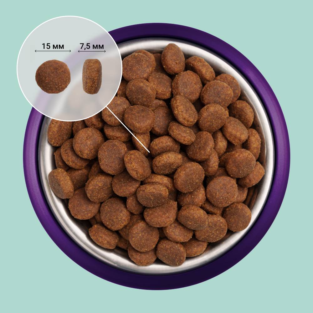 Хороший корм. Грануры среднего размера. Для карликового пуделя подошел отлично. Удобный зип пакет на липучке. Брали корм 3 кг.