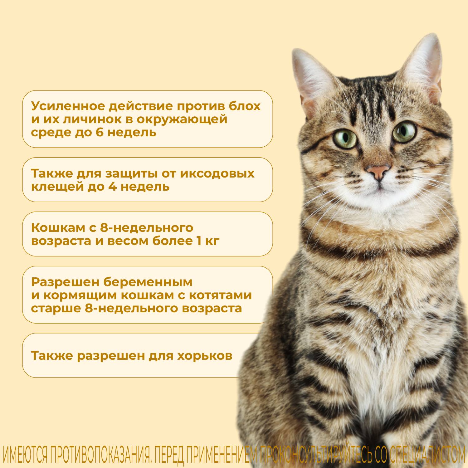 Продолжительность защитного действия препарата от блох: у кошек — до 1.5 месяца.