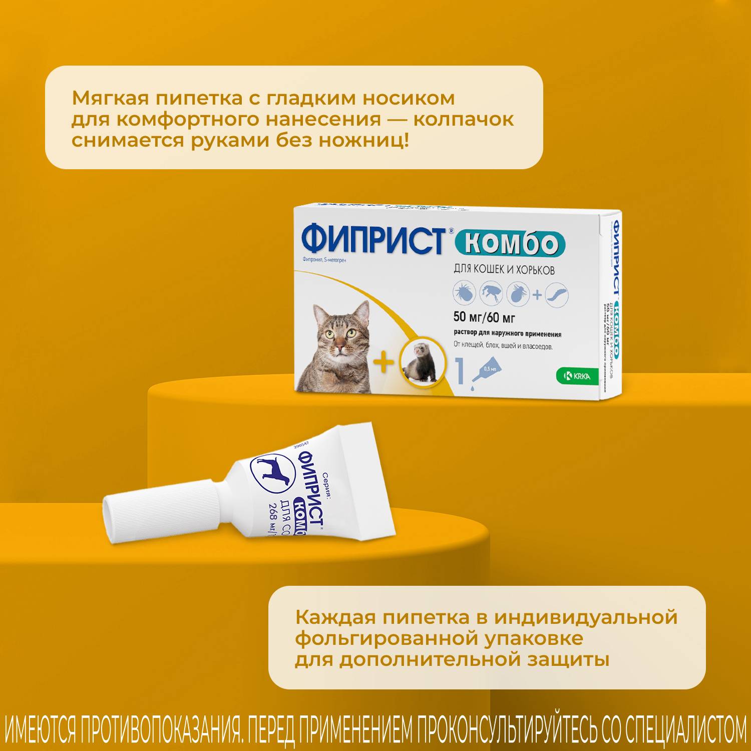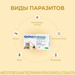 Защита от блох и клещей до 1 месяца. Фиприст Спот Он капли на холку для кошек всех пород от блох и клещей, 3 пипетки — инсектоакарицидный препарат контактного действия. Блокирует рецепторы ГАМК, что приводит к параличу и гибели паразита, который вредит Вашему питомцу.
