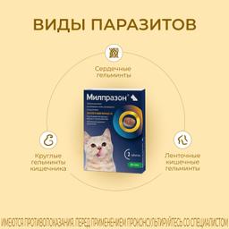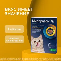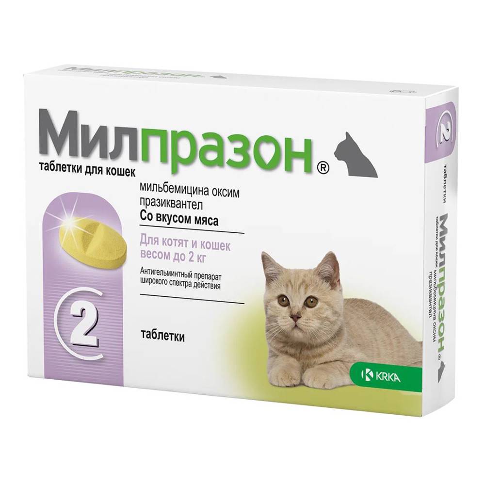Антигельминтик от компании Милпразон разработан в качестве профилактического и лечебного средства против различных заболеваний, вызванных наличием у животного паразитирующих гельминтов. Применяться препарат может для котят и молодых кошек, вес которых составляет не более 2 кг. По мере воздействия на организм животного относится к умеренно опасным. В упаковке содержится 2 таблетки.