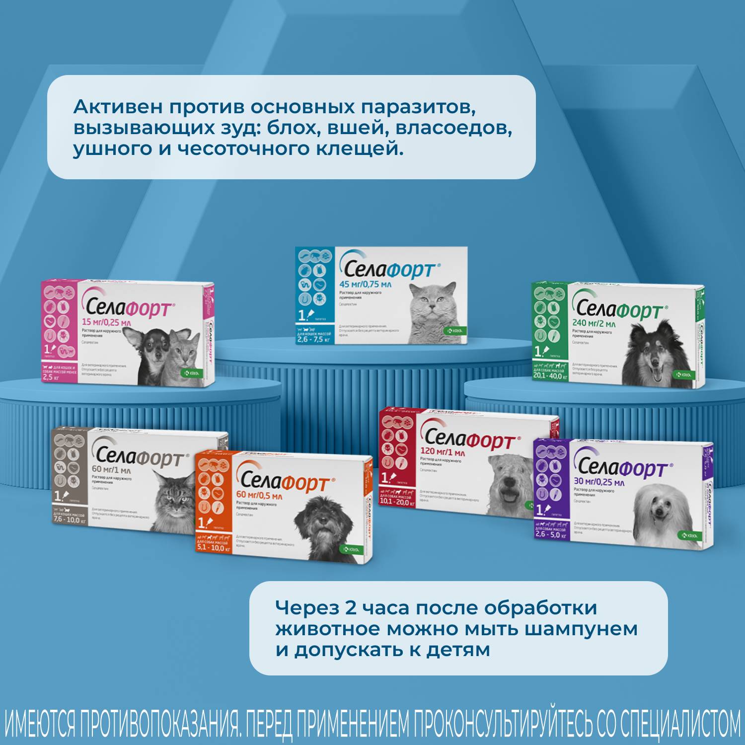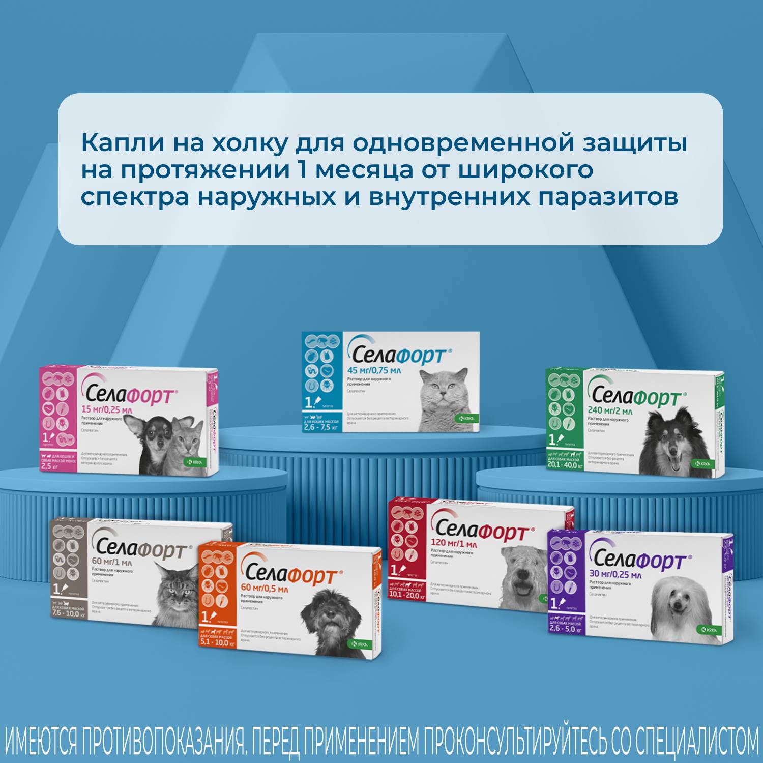 Противопоказанием к применению является повышенная индивидуальная чувствительность животного к компонентам препарата (в том числе и в анамнезе). Селафорт не следует наносить на влажную и/или поврежденную кожу.