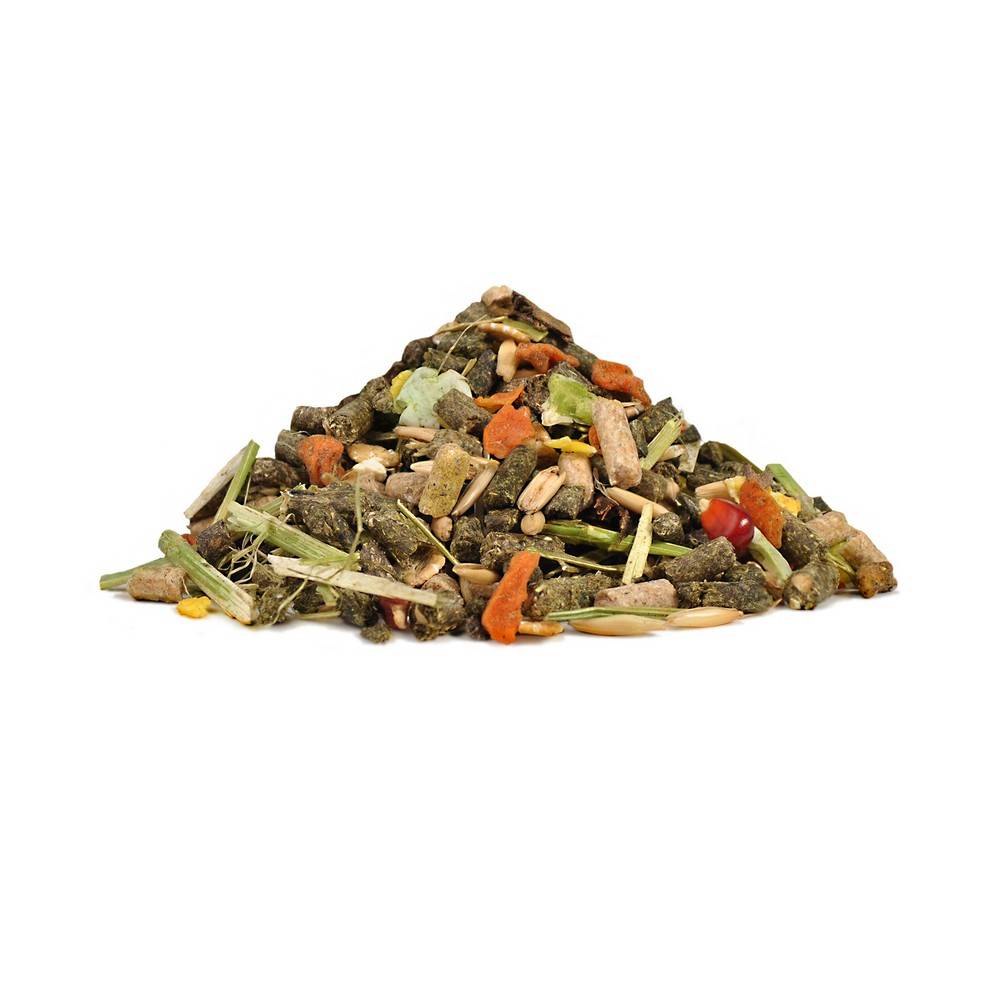 Травяные гранулы, ячмень плющеный, овёс плющеный, хлопья кукурузные, горох плющеный, плоды рожкового дерева (кэроб), морковь сушёная, мультизерновые гранулы, кукуруза красная, яблоко сушёное, люцерна сушёная, фруктоолигосахариды, экстракт юкки.
