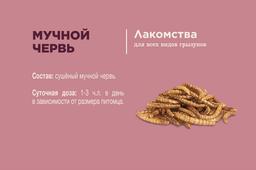 Сушеный мучной червь является питательным дополнительным кормом для всеядных грызунов. Он представляет собой не только их излюбленное лакомство, но и ценный источник необходимого им животного белка. Его добавление позволит внести разнообразие в рацион питомца.
