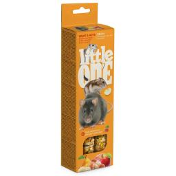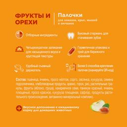 Палочки с фруктами и орехами содержат свыше 20 компонентом, в числе которых любимые грызунами яблоки, груши и арахис. Лакомство является вкусным и полезным дополнением к рациону всеядных грызунов.