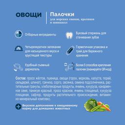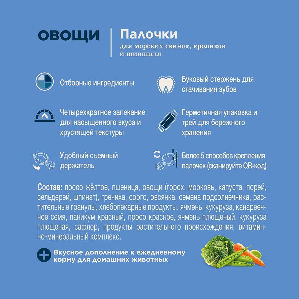 Палочки с овощами – это прекрасное лакомство для морских свинок, кроликов и шиншилл. Лакомство отличается широким разнообразием овощей в составе, в числе которых горох, морковь, капуста, порей, сельдерей и шпинат. Палочки являются вкусным и полезным дополнением к рациону травоядных грызунов, а также источником необходимых им витаминов и минералов.