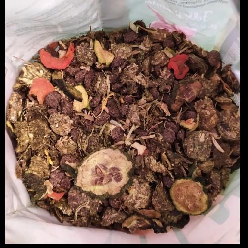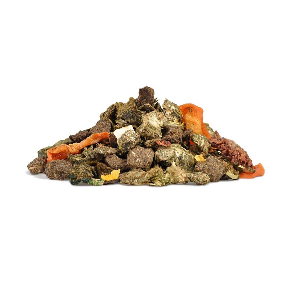 - В его состав входит 60 разновидностей трав, шишки хмеля, а также самые любимые кроликами овощи и цветы – огурец, морковь, сельдерей, цветы календулы и др.