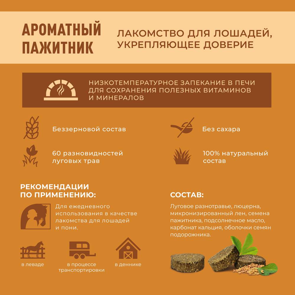 Лакомства изготовлены из 100% натуральных ингредиентов и содержат ароматные семена пажитники и луговое разнотравье, благодаря чему понравятся даже самым привередливым лошадям и пони.