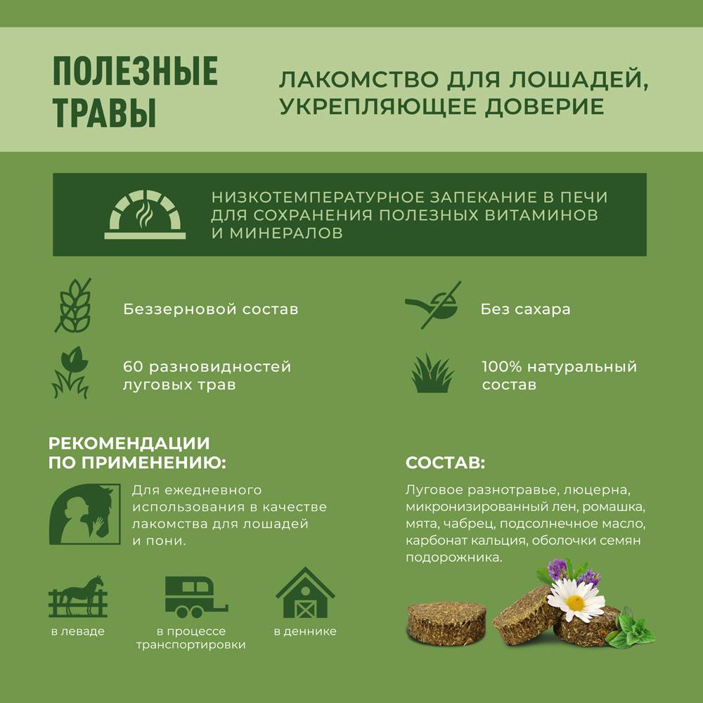 В состав продукта входят целебные ромашка и чабрец, а также мята и люцерна, что делает его привлекательными даже для привередливых лошадей и пони.