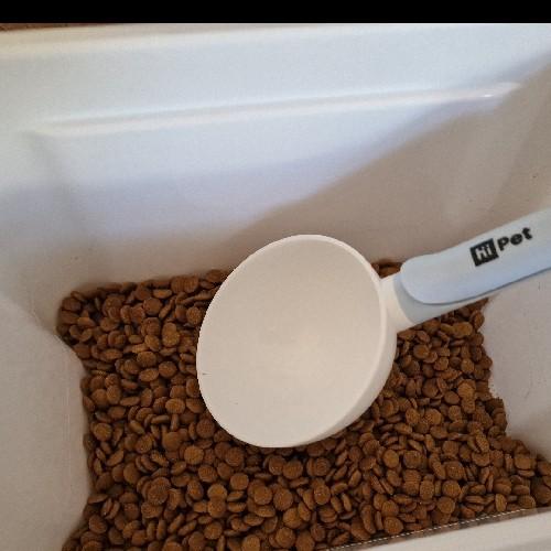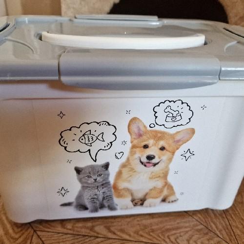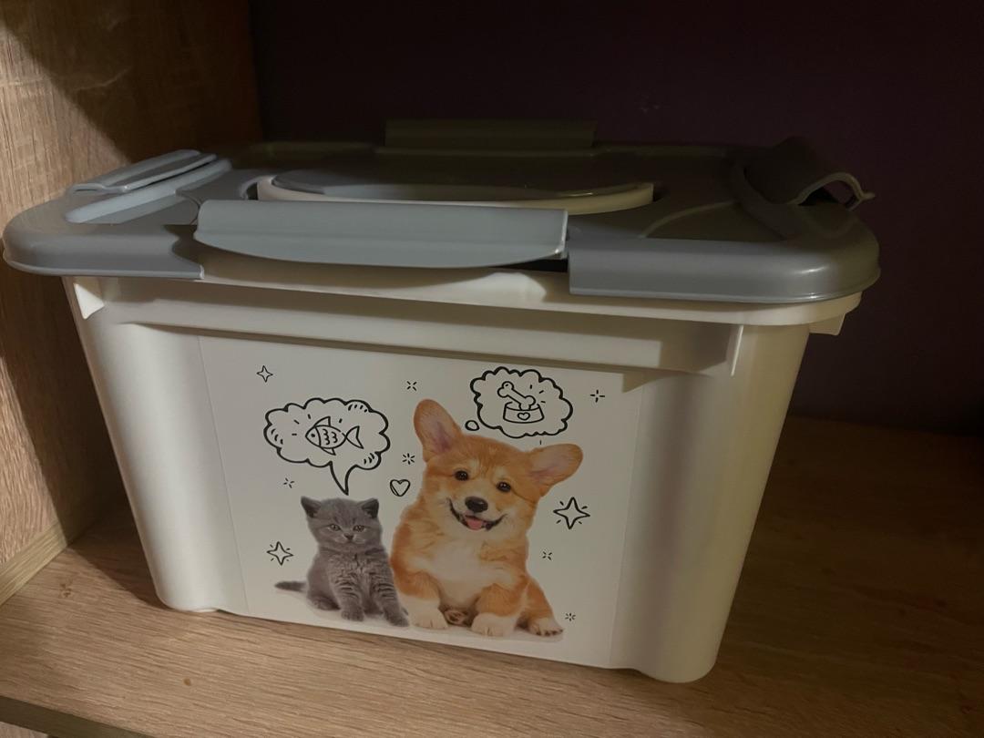 Специальная выемка на крышке позволяет спрятать ручку для штабелирования контейнеров. Декор нанесен с помощью технологии IML: он не стирается и не повреждается в процессе использования. Контейнер изготовлен из безопасного полипропилена. В зависимости от плотности сухого корма, размера и формы гранул, контейнер может вместить от 2,5 до 4,5 кг корма.