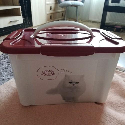 Специальная выемка на крышке позволяет спрятать ручку для штабелирования контейнеров. Декор нанесен с помощью технологии IML: он не стирается и не повреждается в процессе использования. Контейнер изготовлен из безопасного полипропилена. В зависимости от плотности сухого корма, размера и формы гранул, контейнер может вместить от 2,5 до 4,5 кг корма.