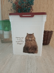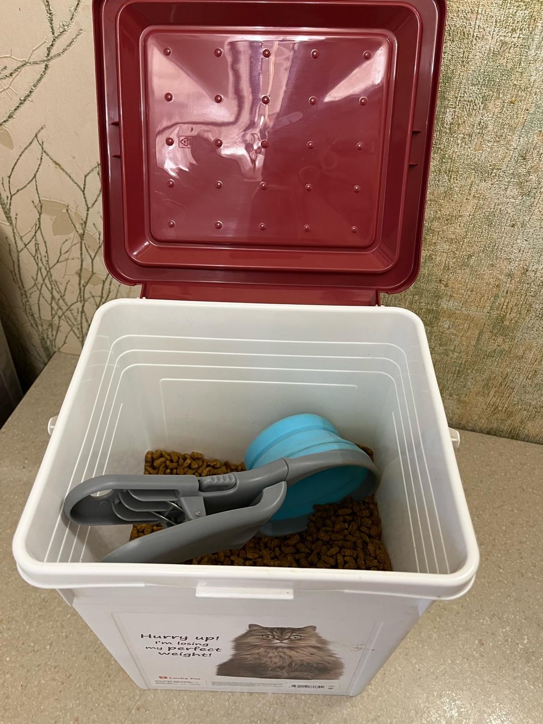 Крышка герметично фиксируется и защищает содержимое от посторонних запахов и влаги. Герметичная крышка надежно защищает корм от заветривания, попадания света, влаги и вредителей, а удобная прочная ручка помогает переносить контейнер с места на место. Плоская крышка позволит ставить один контейнер на другой для экономии места. В зависимости от плотности сухого корма, размера и формы гранул, контейнер может вместить от 3,5 до 6 кг корма.
