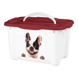 Специальная выемка на крышке позволяет спрятать ручку для штабелирования контейнеров. Декор нанесен с помощью технологии IML: он не стирается и не повреждается в процессе использования. Контейнер изготовлен из безопасного полипропилена. В зависимости от плотности сухого корма, размера и формы гранул, контейнер может вместить от 2,5 до 4,5 кг корма.