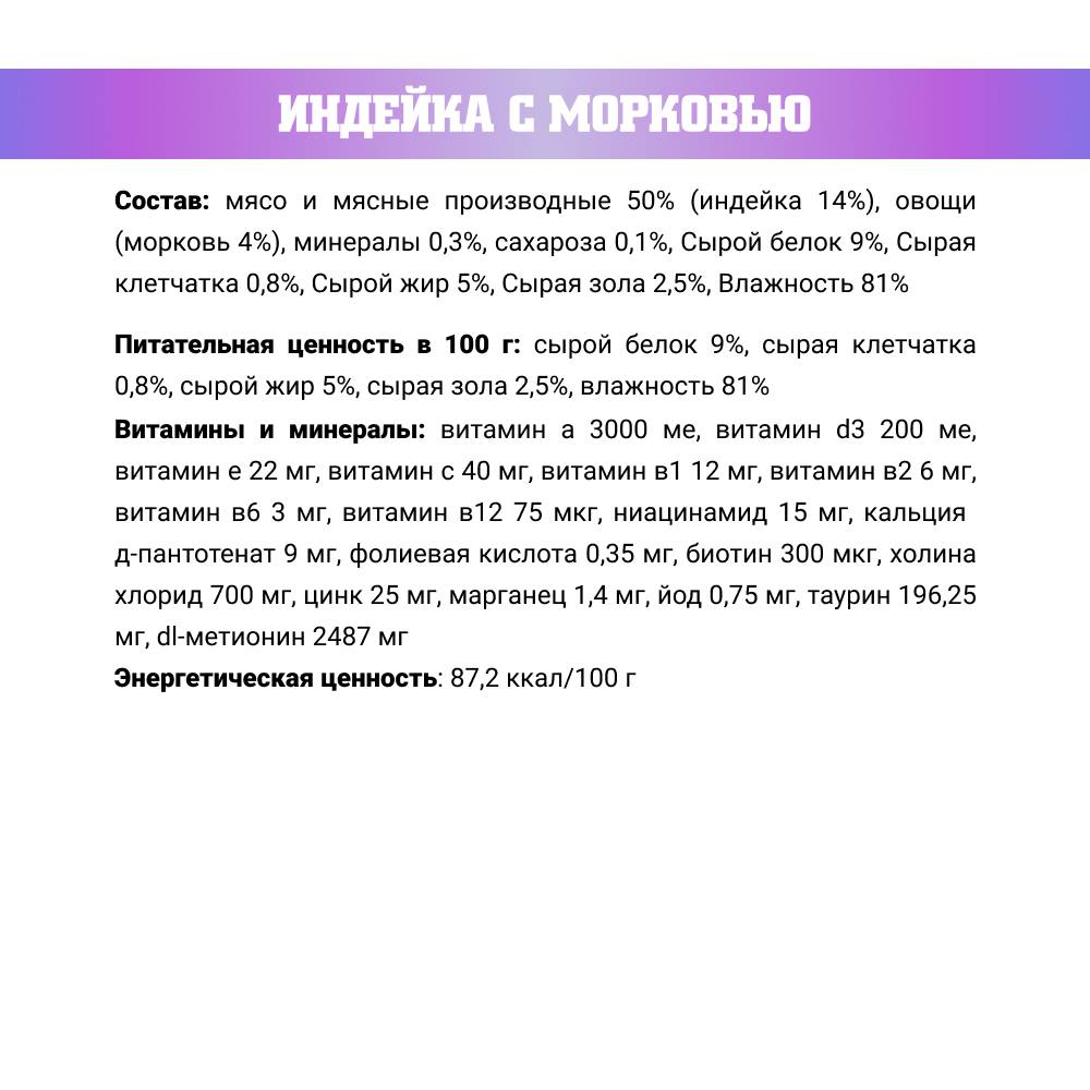 Хороший состав. Российский производитель. Кот (1,5 года) ел с огромным удовольствием. Удобно отделить часть продукта и кормить маленькими порциями.