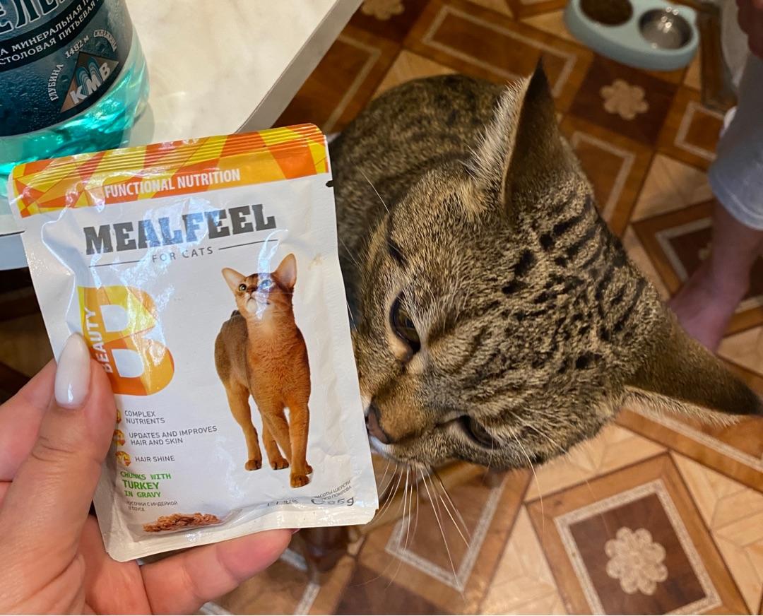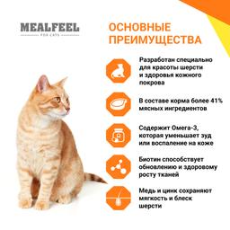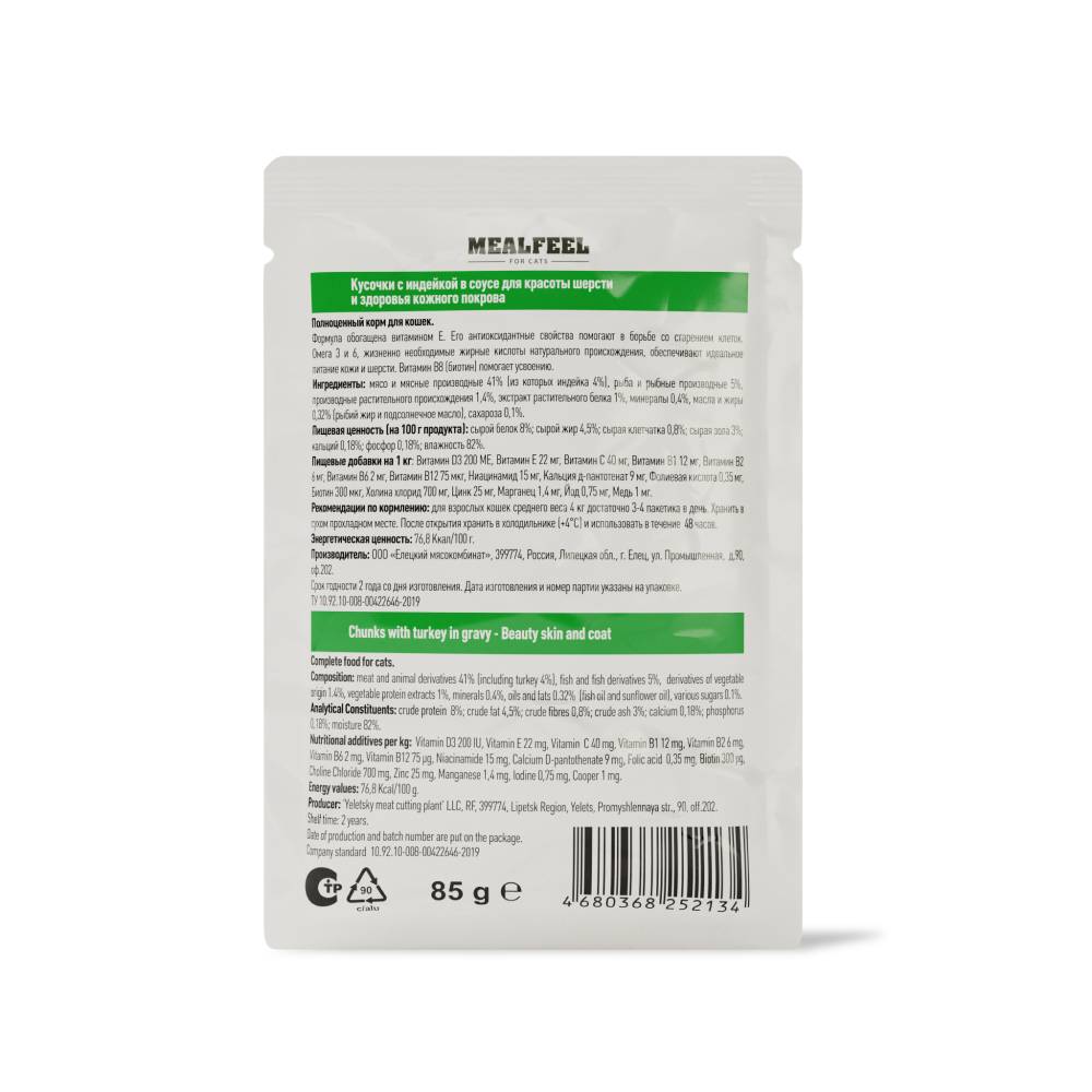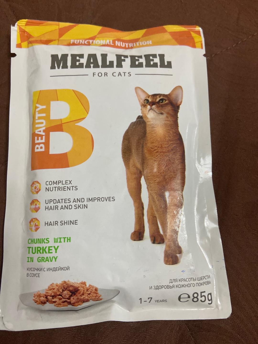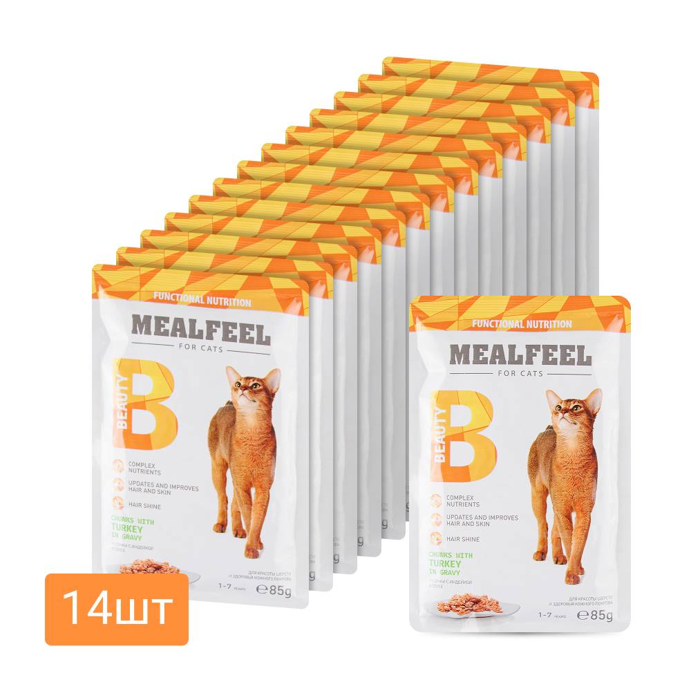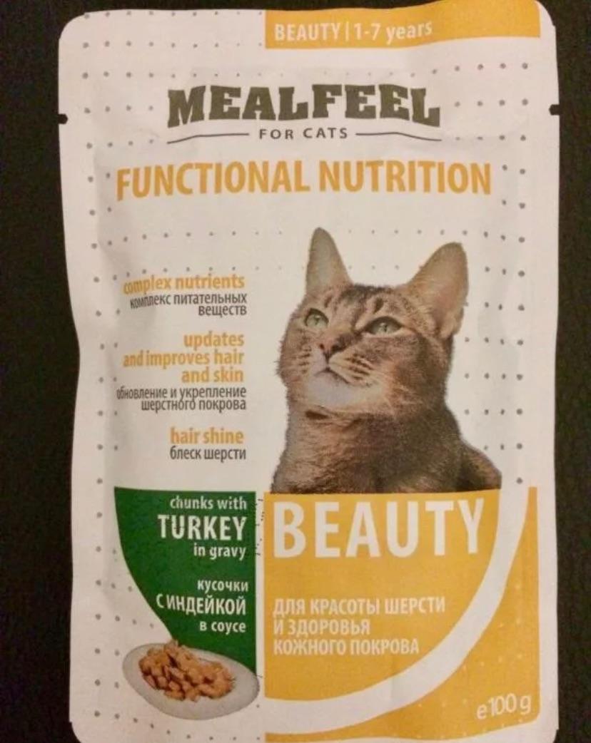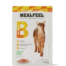 Mealfeel Beauty – полноценный сбалансированный рацион в виде мясных кусочков в соусе, разработанный специально для взрослых кошек. Корм направлен на поддержку здоровья и красоты шерсти животного, благодаря входящим в состав Омега-3-6 жирным кислотам и биотину.