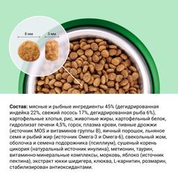- В составе корма 15% свежего лосося, что обеспечивает высокую вкусовую привлекательность продукта.
