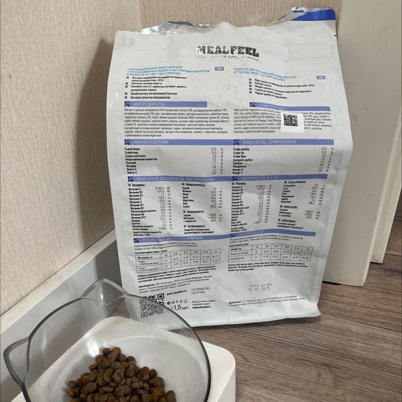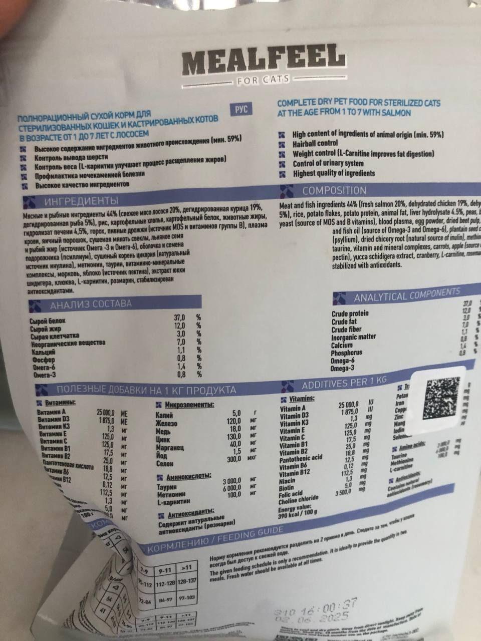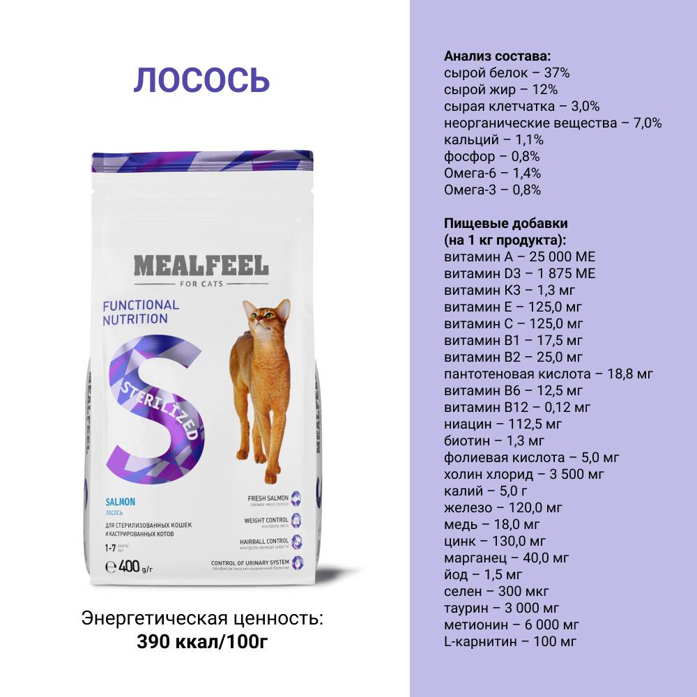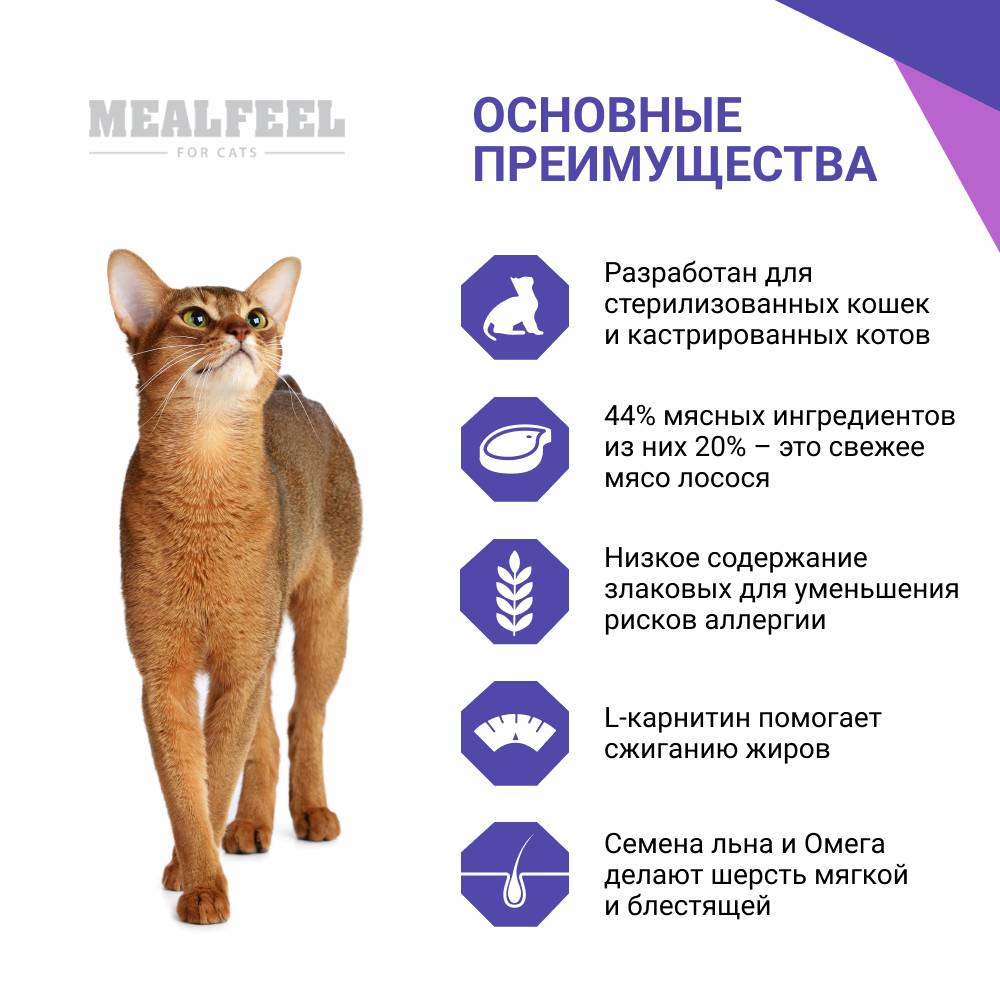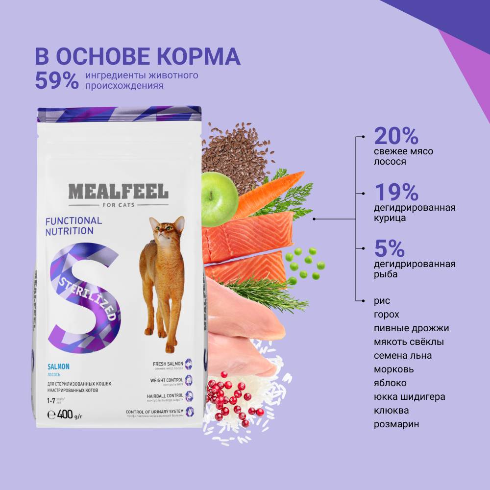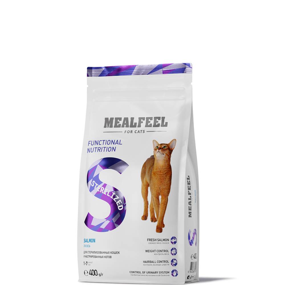 MEALFEEL STERILIZED – полноценный рацион на основе свежей рыбы, разработан с учетом всех потребностей стерилизованных кошек и кастрированных котов в возрасте 1-7 лет, производится из отборных ингредиентов высокого качества.