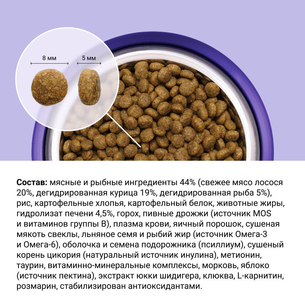 - 44% мясных ингредиентов, из них 20% - это свежее мясо лосося, которое обеспечивает высококачественный и легко усваиваемый белок — строительный материал для здоровья и иммунитета питомца.