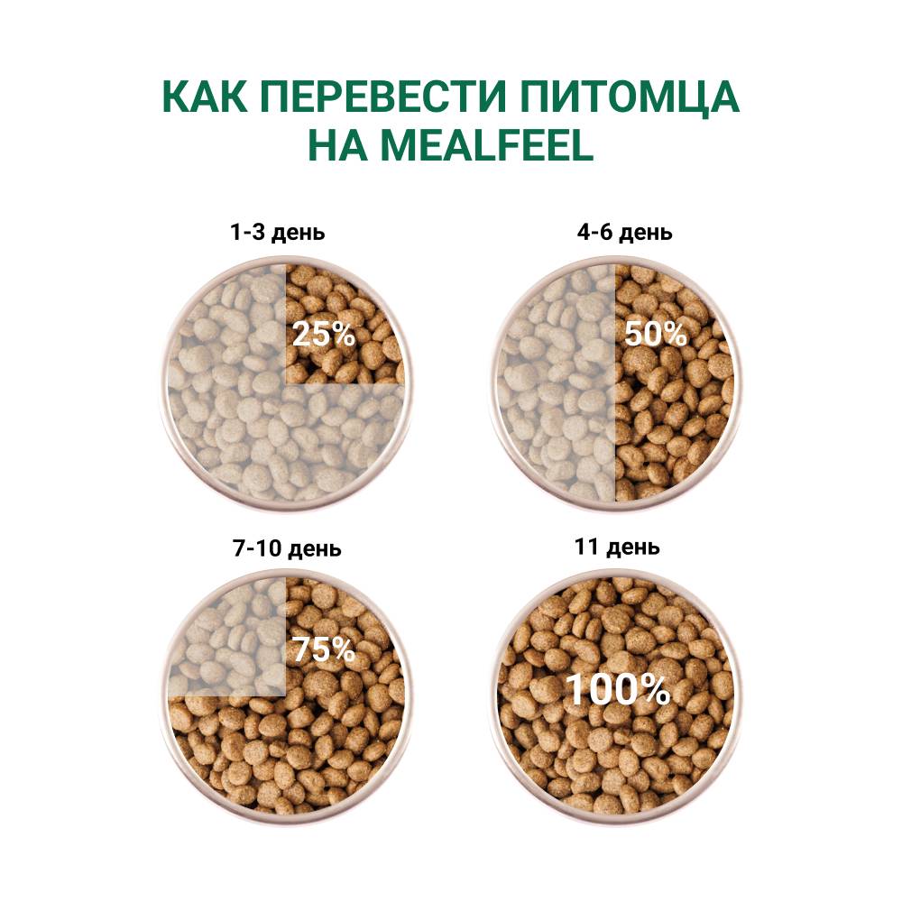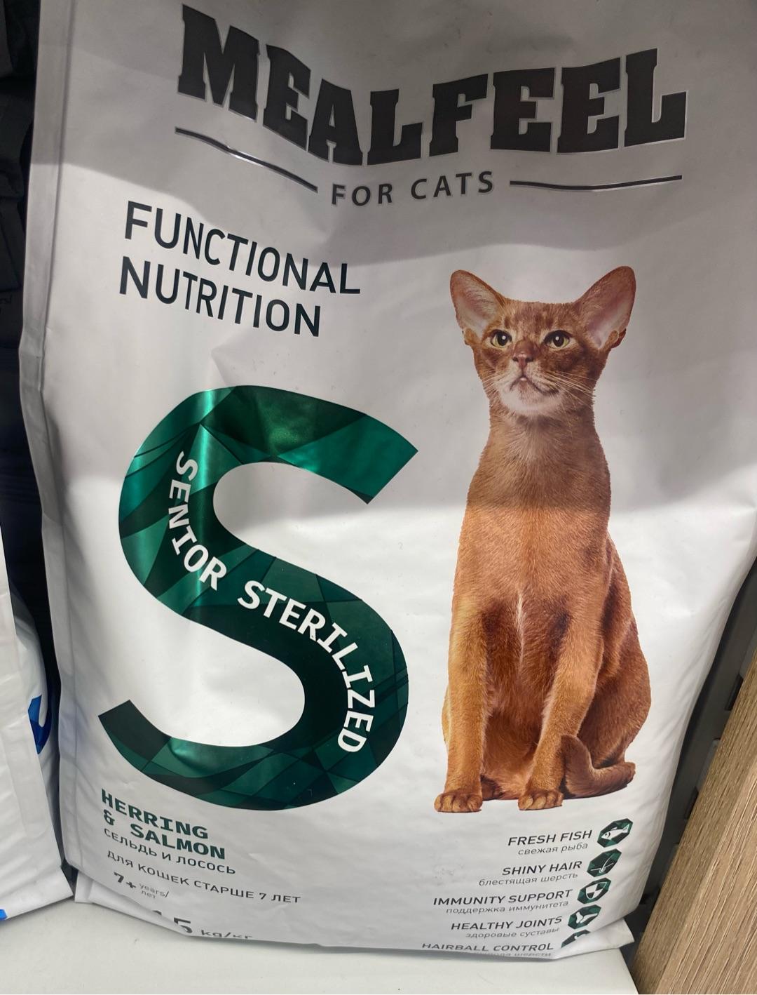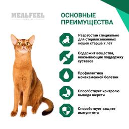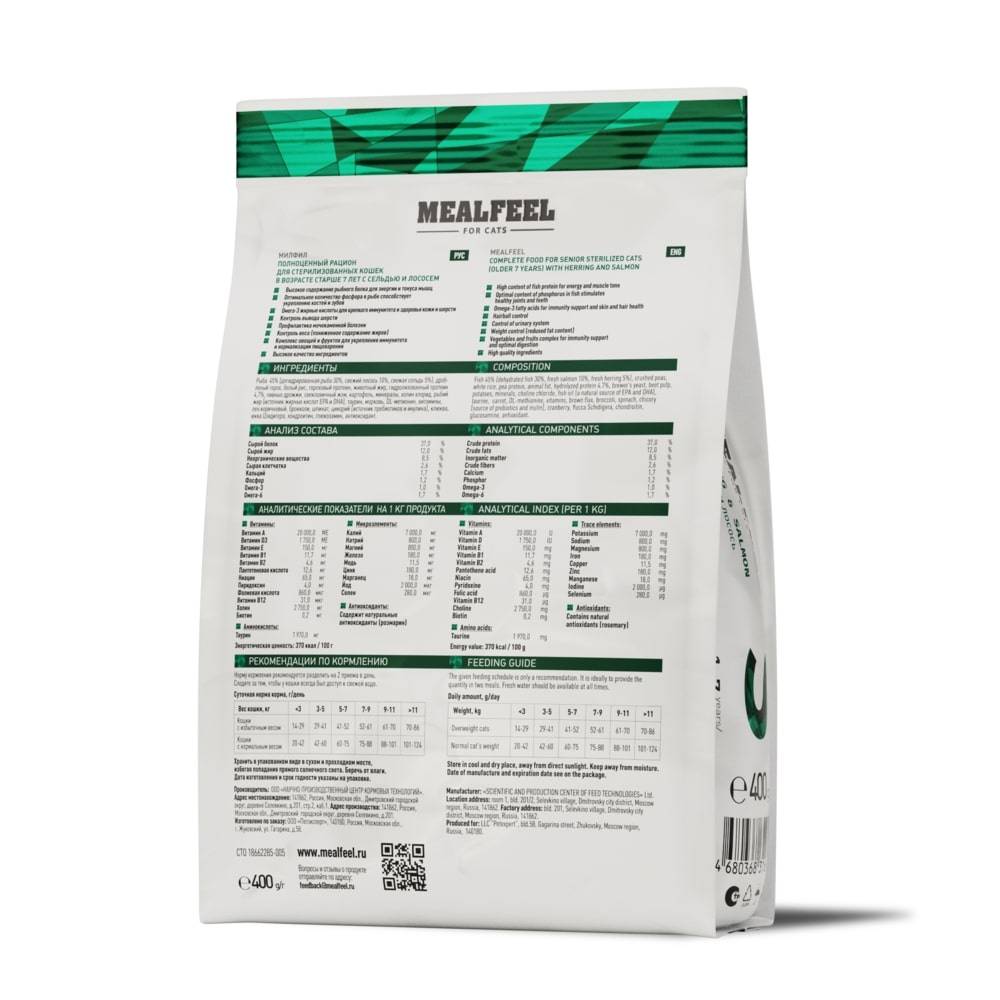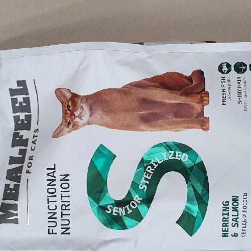 Mealfeel Senior Sterilized– корм, разработанный специально для стерилизованных кошек старше 7 лет. Поддерживает здоровье стерилизованных и кастрированных питомцев, оказывая профилактику мочекаменной болезни. Особая формула помогает бороться с проблемами взрослых кошек – улучшает состояние и внешний вид шерсти, а также способствует контролю веса на фоне уменьшающейся активности.