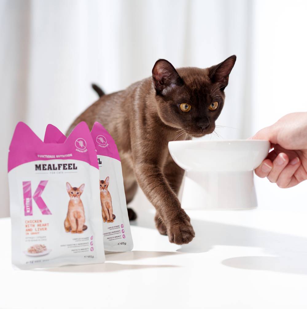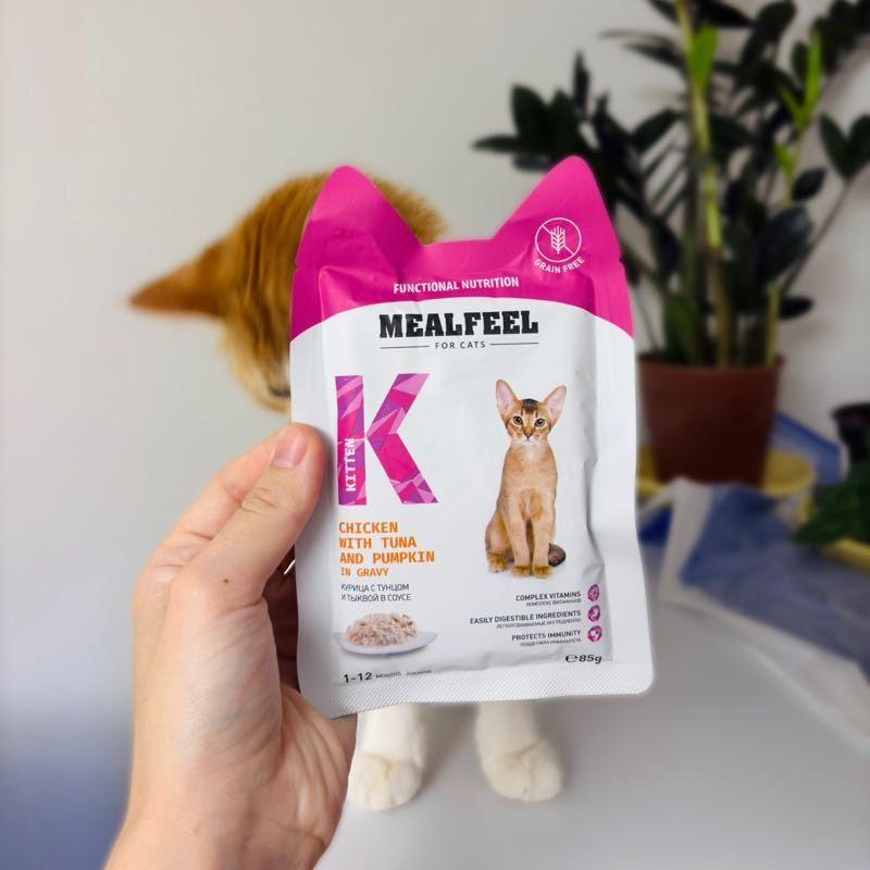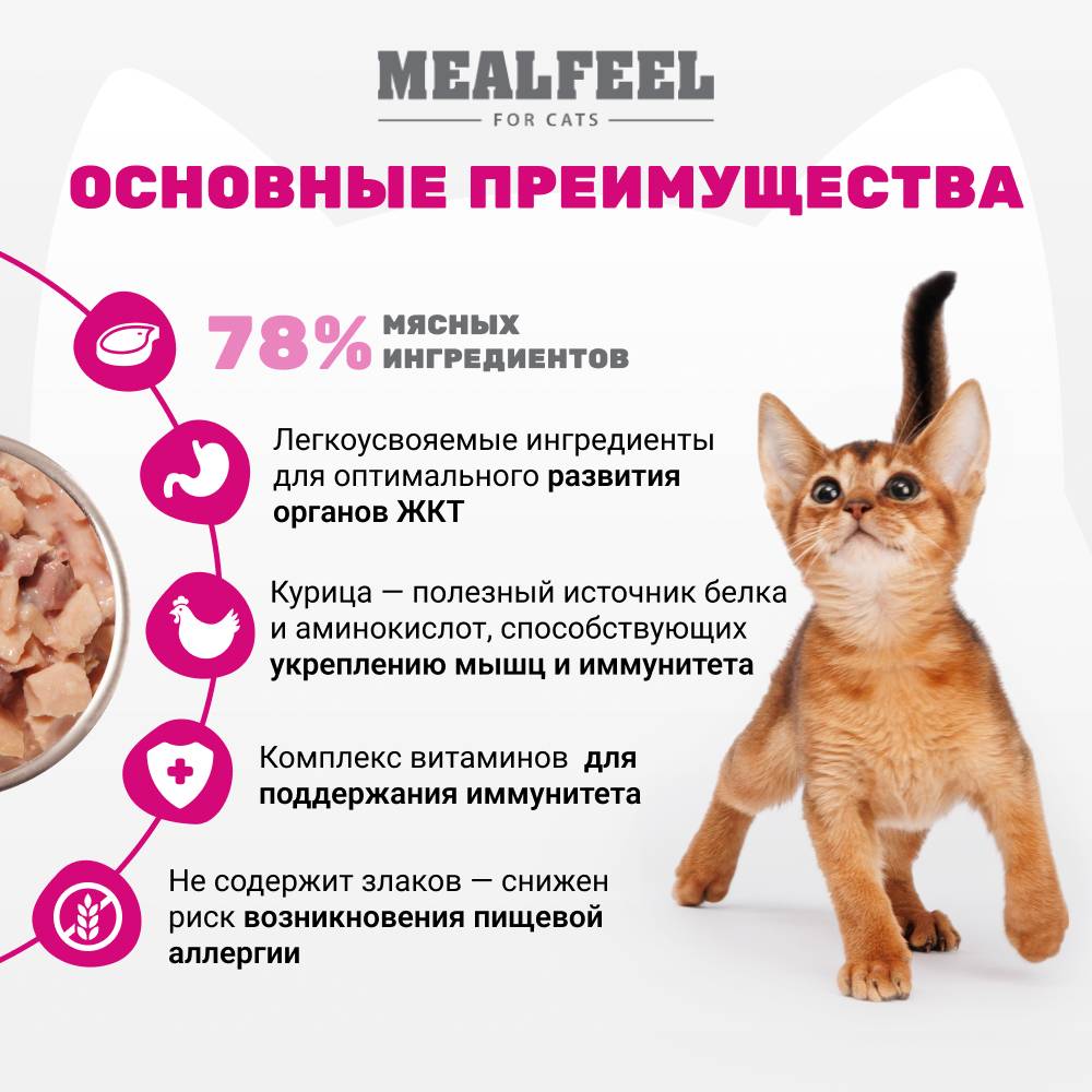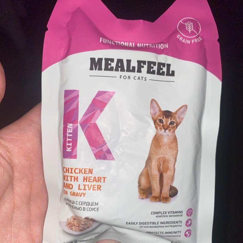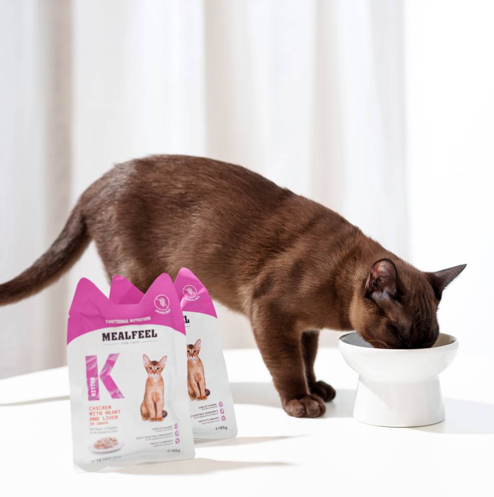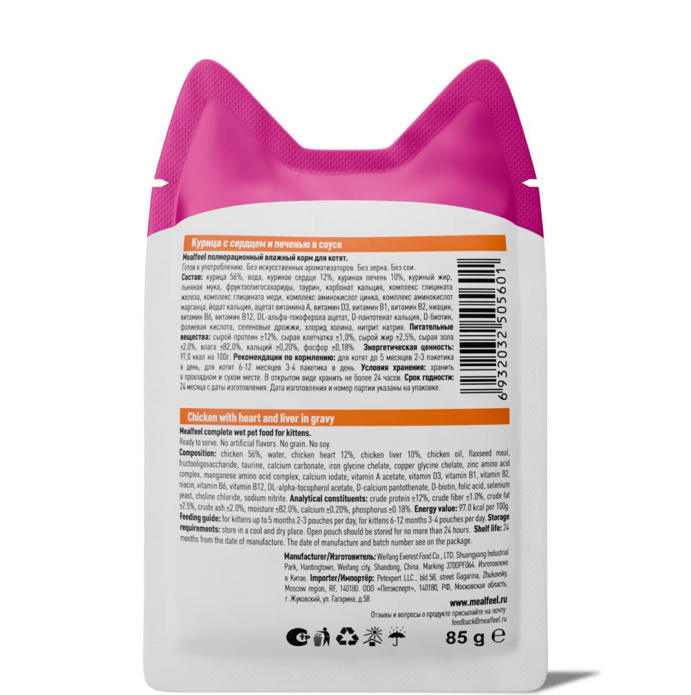 Mealfeel с курицей, печенью и сердцем в соусе – полнорационный влажный корм для котят. Сочные кусочки в нежном соусе обладают изысканным вкусом и содержат комплекс полезных веществ для роста и развития.