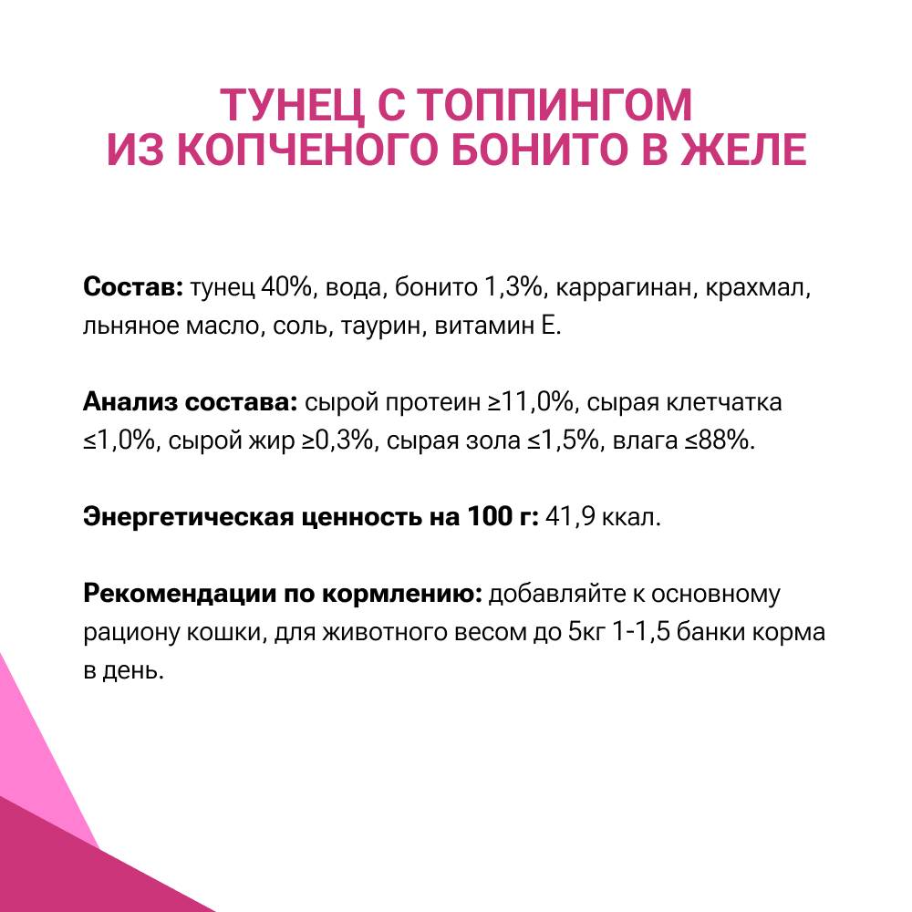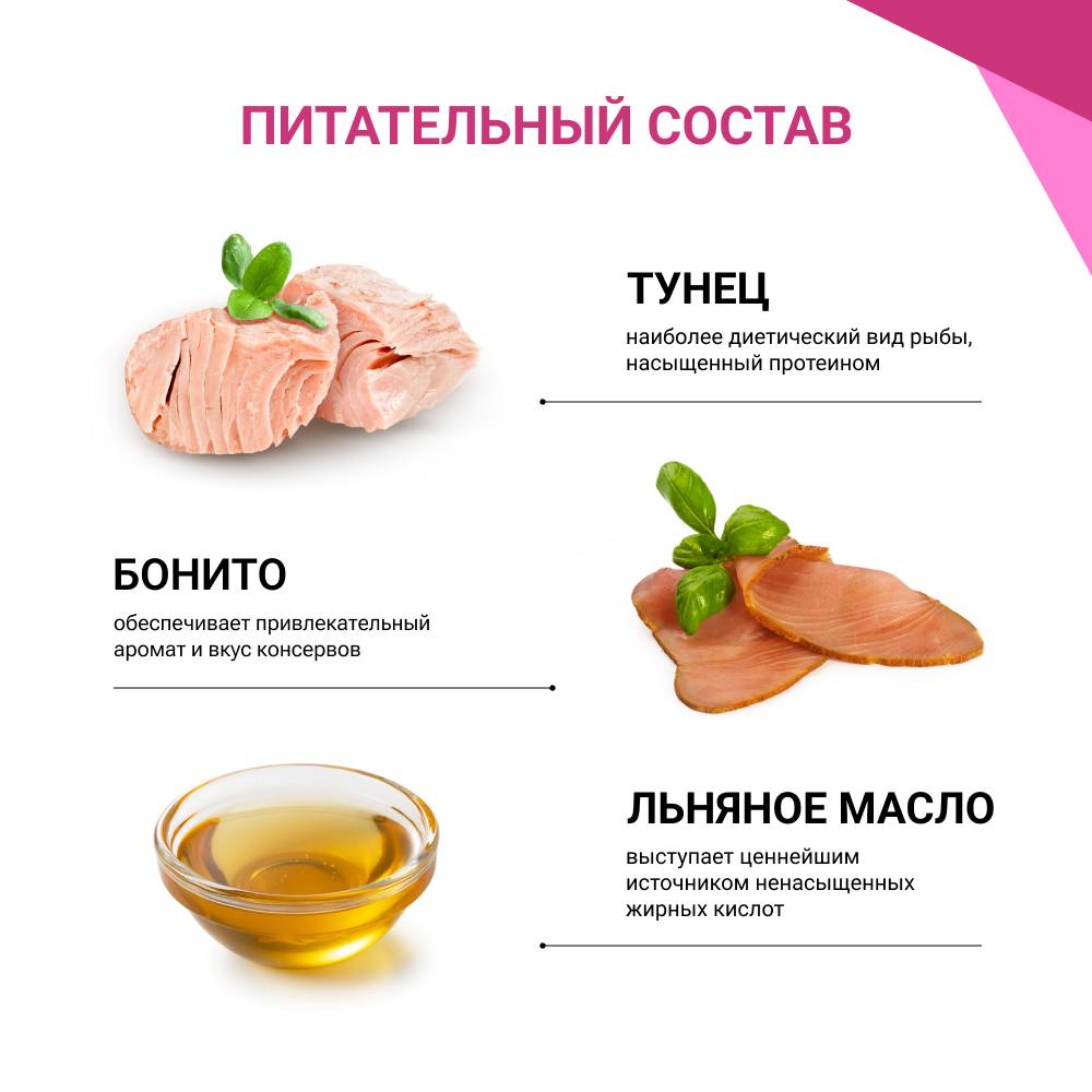 - Тунец - содержит кальций, железо, фосфор, селен, магний и цинк, которые важны для нормальной работы иммунитета, богат жирными кислотами Омега-3 и Омега-6, необходимыми для поддержания здоровья кожи и шерсти.