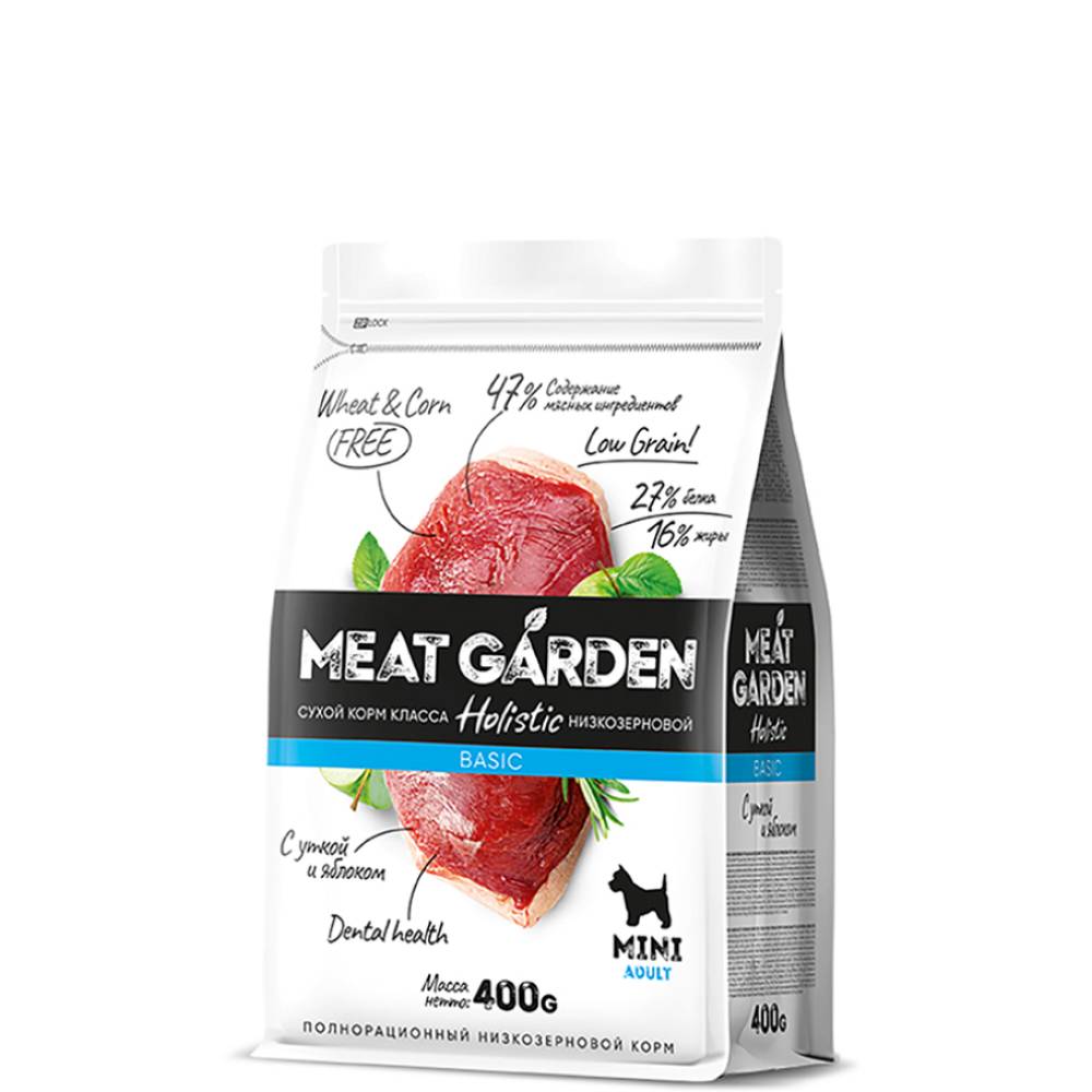 Сухой полнорационный корм для взрослых собак мелких пород с уткой и яблоком.