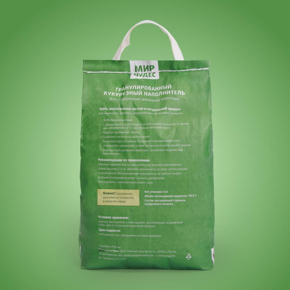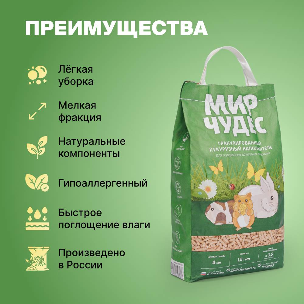 Гранулированный наполнитель МИР ЧУДЕС из кукурузы сделает уборку за домашними животными удобной и комфортной.