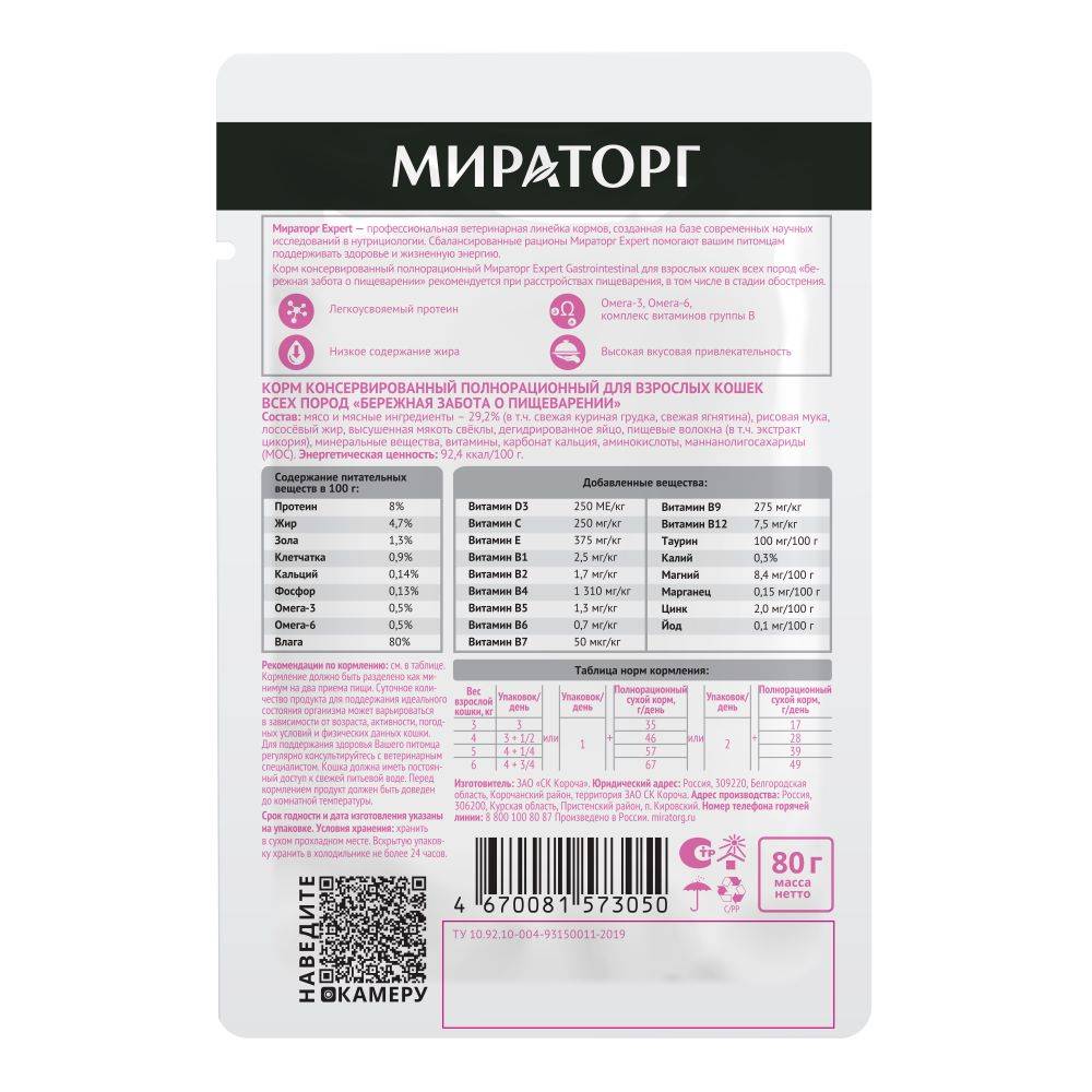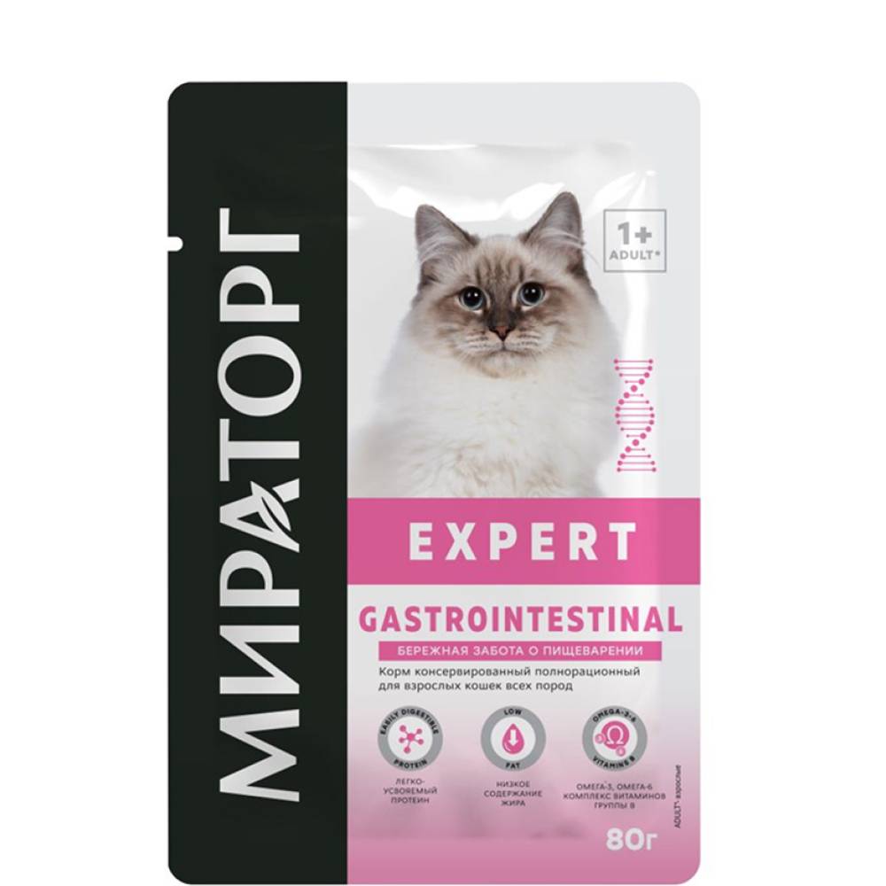 Мираторг Expert - профессиональная линейка кормов, созданная на базе современных научных исследований в нутрициологии. Сбалансированные рационы Мираторг Expert помогают вашим питомцам поддерживать здоровье и жизненную энергию. Gastrointestinal – ветеринарная диета, для защиты пищеварительной системы, которая способствует нормализации работы желудочно-кишечного тракта.