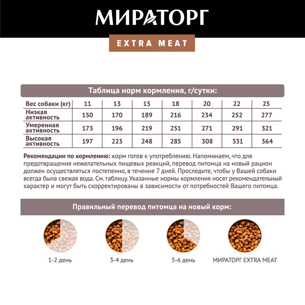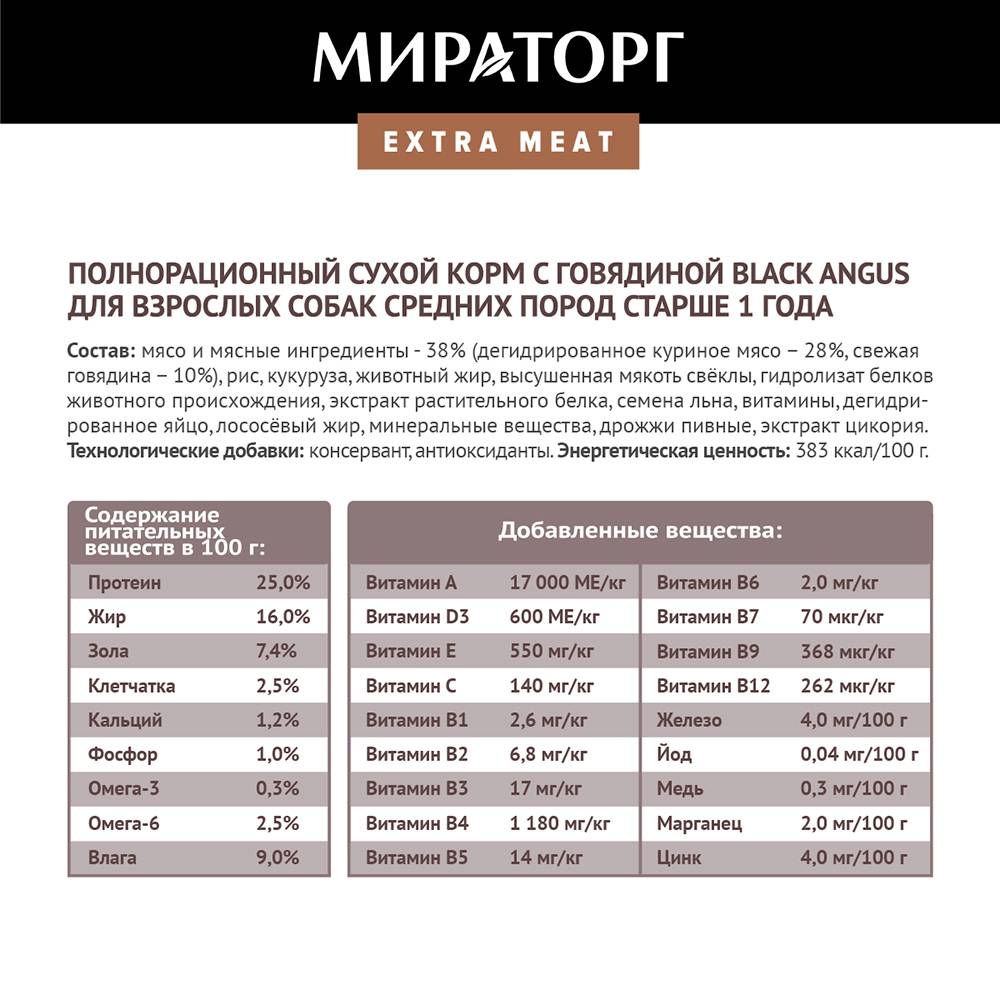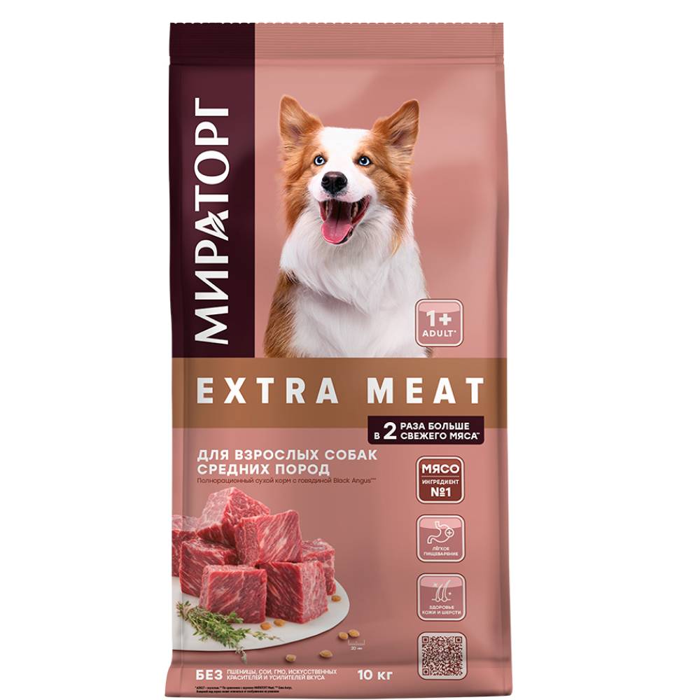 Средние породы собак активны и любознательны, и питание должно соответствовать их образу жизни. Сбалансированный корм Мираторг Extra Meat с высоким содержанием мяса и натуральными ингредиентами даст питомцу необходимую энергию и улучшит его здоровье: