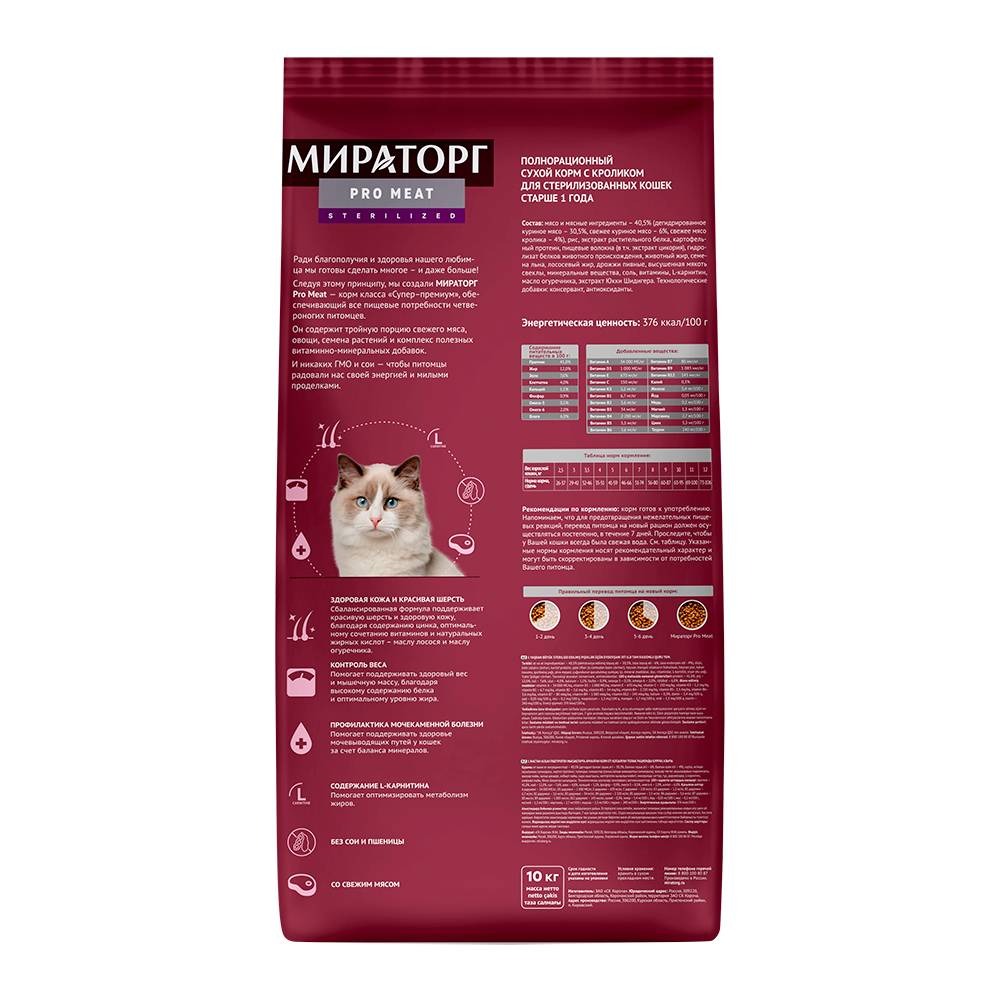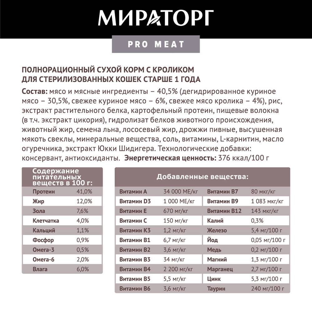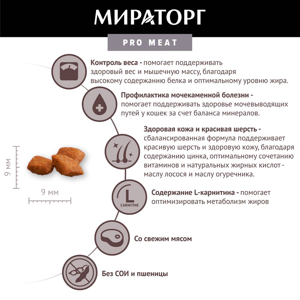 После кастрации и стерилизации предрасположенность кошек к появлению избыточной массы тела и мочекаменной болезни возрастает. С учетом этих особенностей был создан полнорационный корм PRO MEAT, который снижает вероятность появление лишнего веса и мочекаменной болезни.