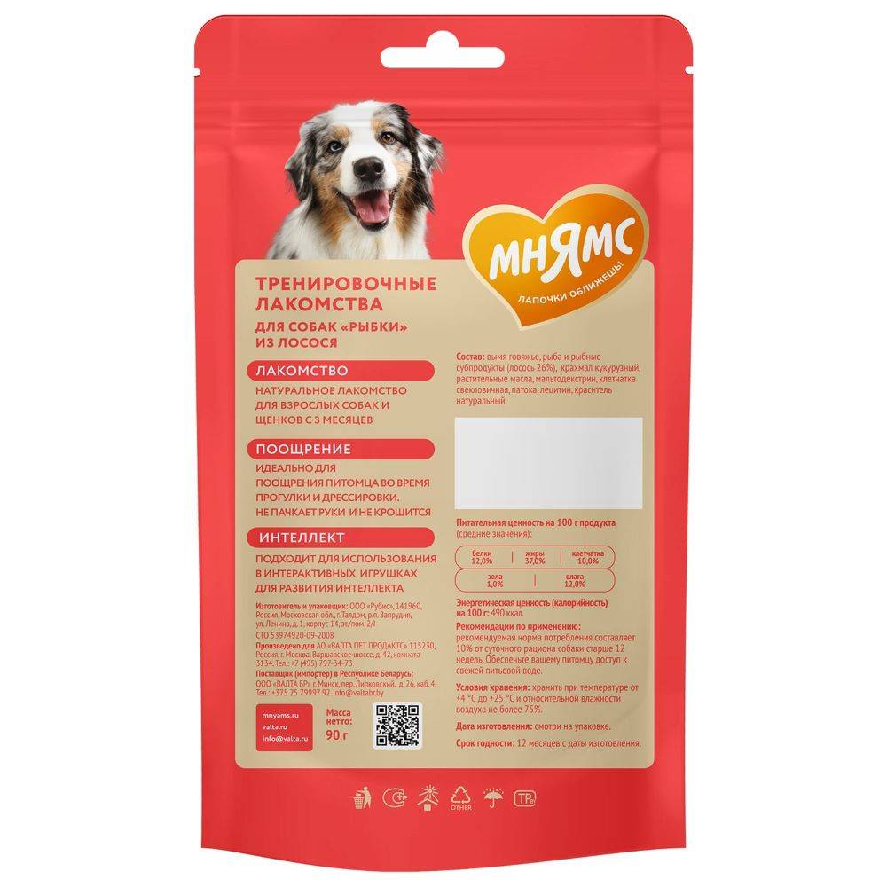 Мнямс тренировочные лакомства "Рыбки" из лосося для взрослых собак и щенков старше 3-х месяцев предназначены для поощрения питомца во время прогулки и дрессировки.