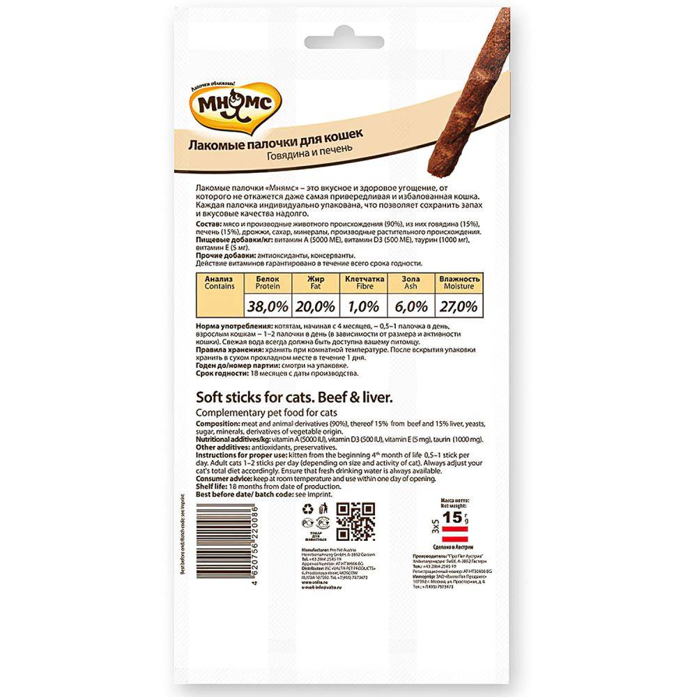 Мнямс лакомые палочки с говядиной и печенью – отличный выбор для вашей кошки. Мягкие палочки изготовлены из высококачественного натурального сырья и подходят для кормления котят с 4-х месяцев.