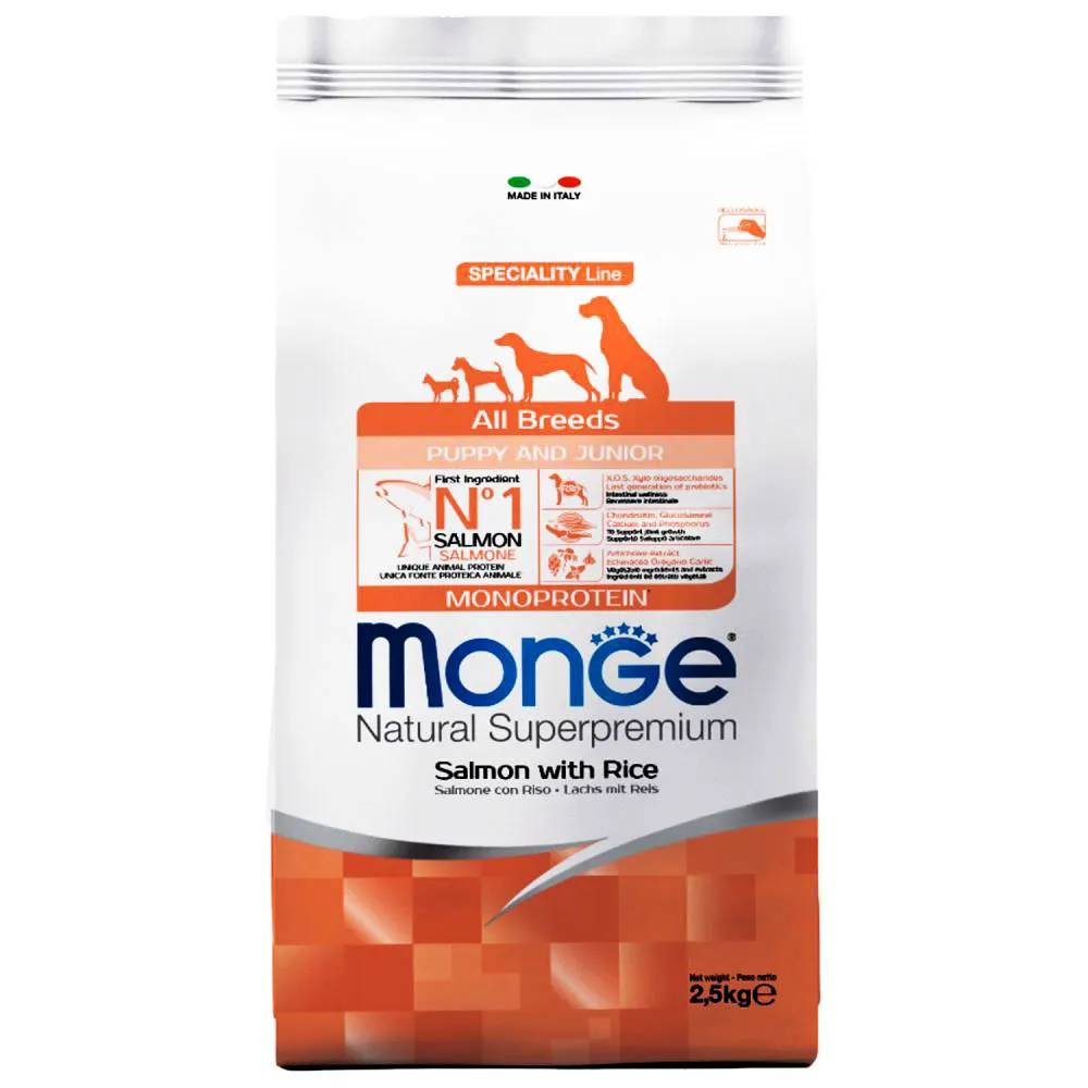 MONGE SPECIALITY LINE ALL BREEDS PUPPY & JUNIOR SALMONE AND RICE - это полноценный сбалансированный рацион для щенков всех пород. Оптимален для собак, склонных к аллергическим воспалительным реакциям.