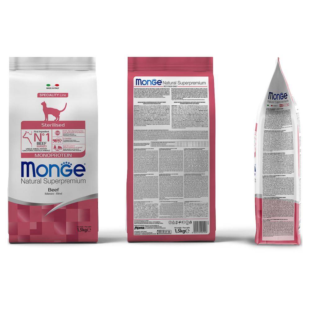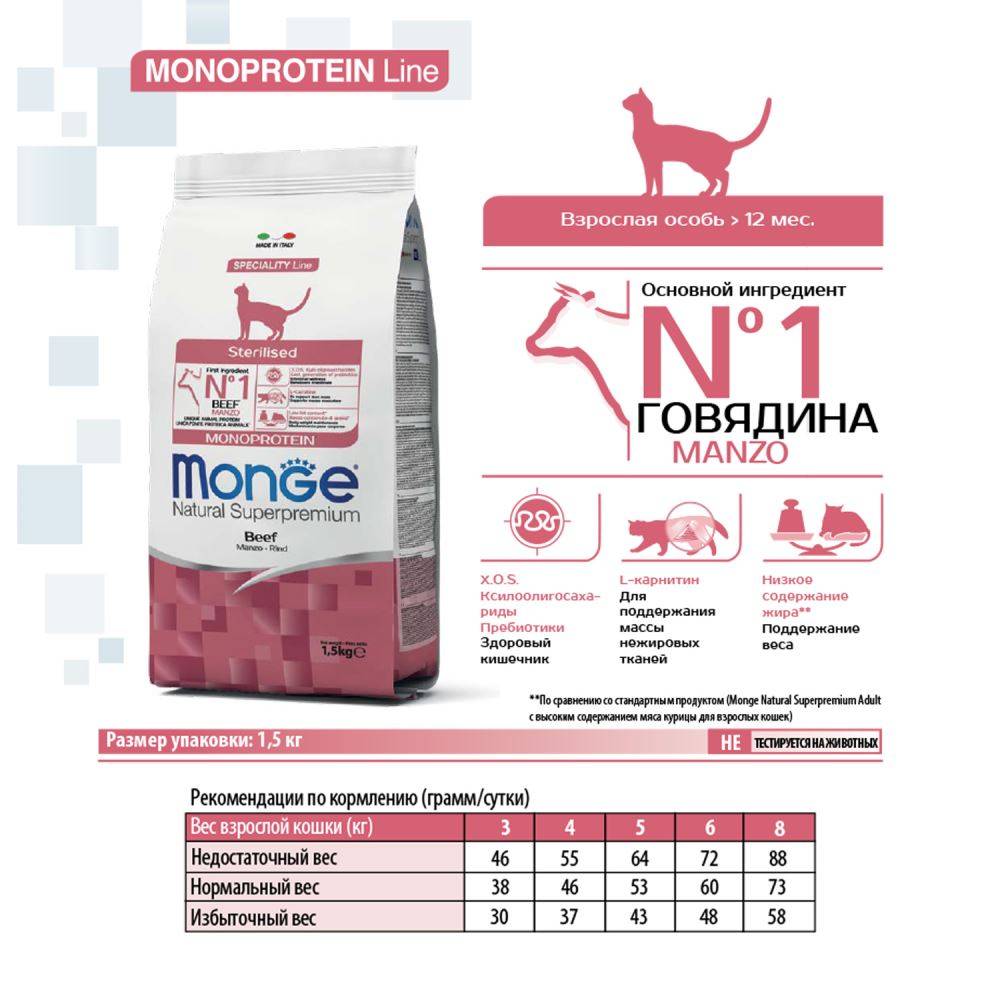 Monge Cat Monoprotein Sterilised Beef корм для стерилизованных кошек с говядиной – это полноценный сбалансированный рацион для стерилизованных кошек с пониженным содержанием калорий, обеспечивающий профилактику ожирения.