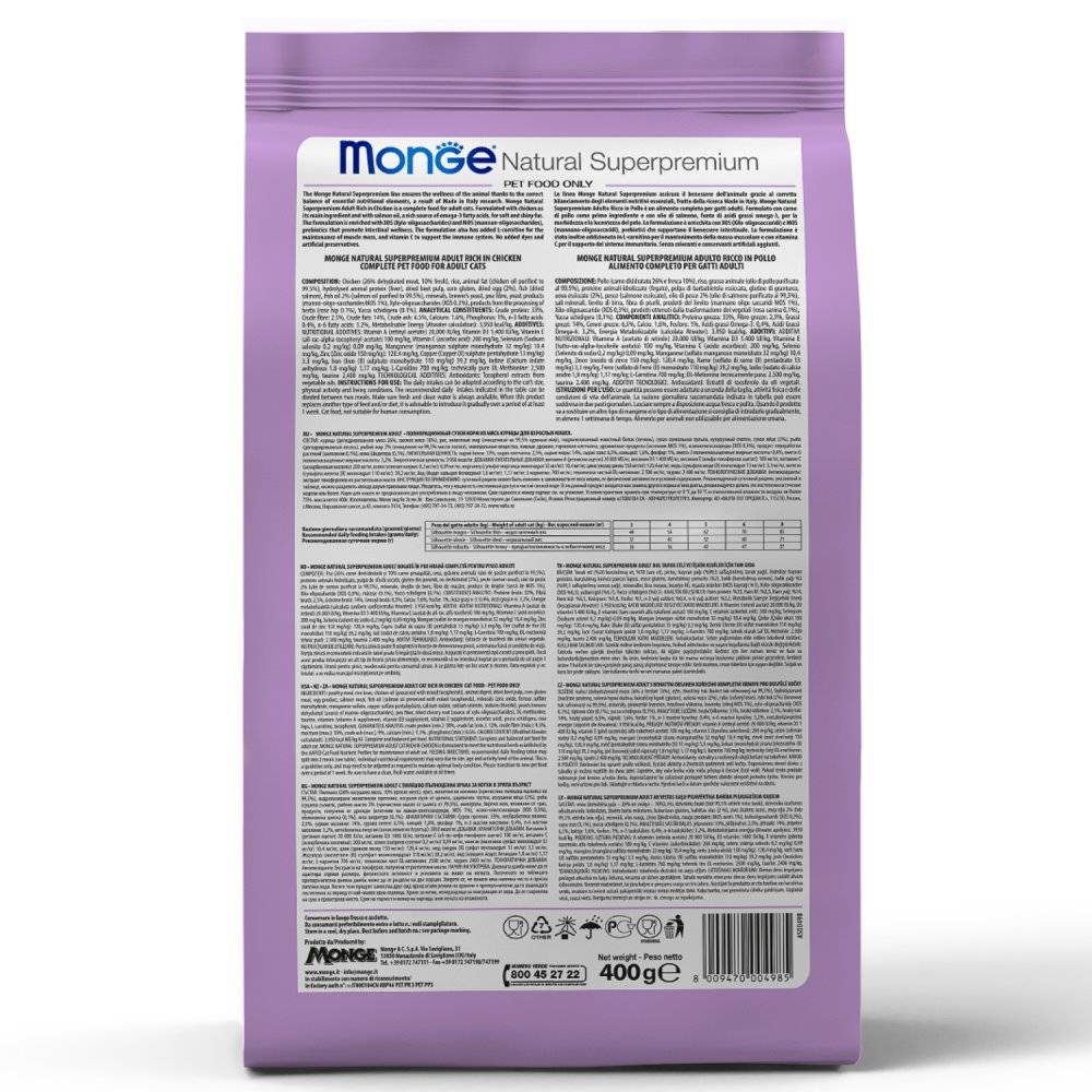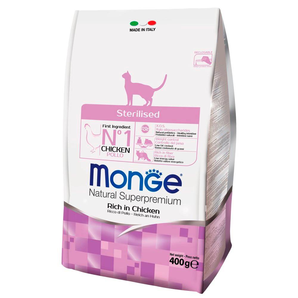 Monge Cat Sterilised корм для стерилизованных кошек — полноценный сбалансированный корм для кастрированных и стерилизованных кошек с пониженным содержанием калорий, обеспечивающим профилактику ожирения. Содержит важнейшие антиоксиданты, такие как витамин Е, для поддержания иммунной системы.