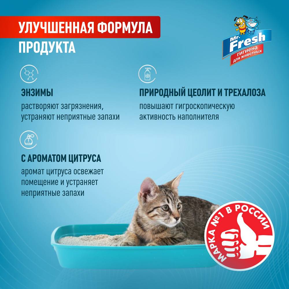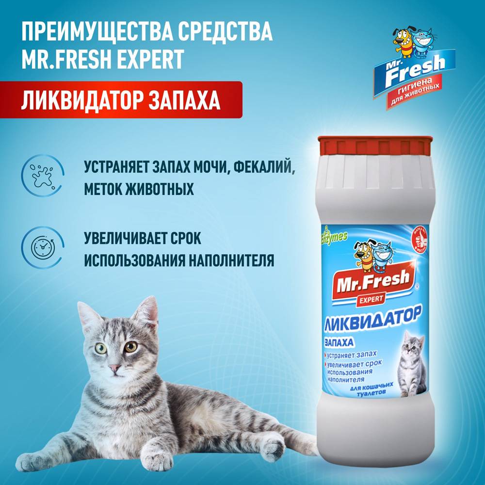 Доброго времени суток!У меня два кота, лоток большой, крытый.Наполнитель комкующийся. Mr. Fresh значительно продлевает свежесть наполнителя. После мытья лотка Лайной, насыпаю на дно Mr. Fresh, сверху слой наполнителя. Неприятные запахи появляются ни так быстро,лоток дольше остается свежим.Упаковки хватает на 5-6 применений.