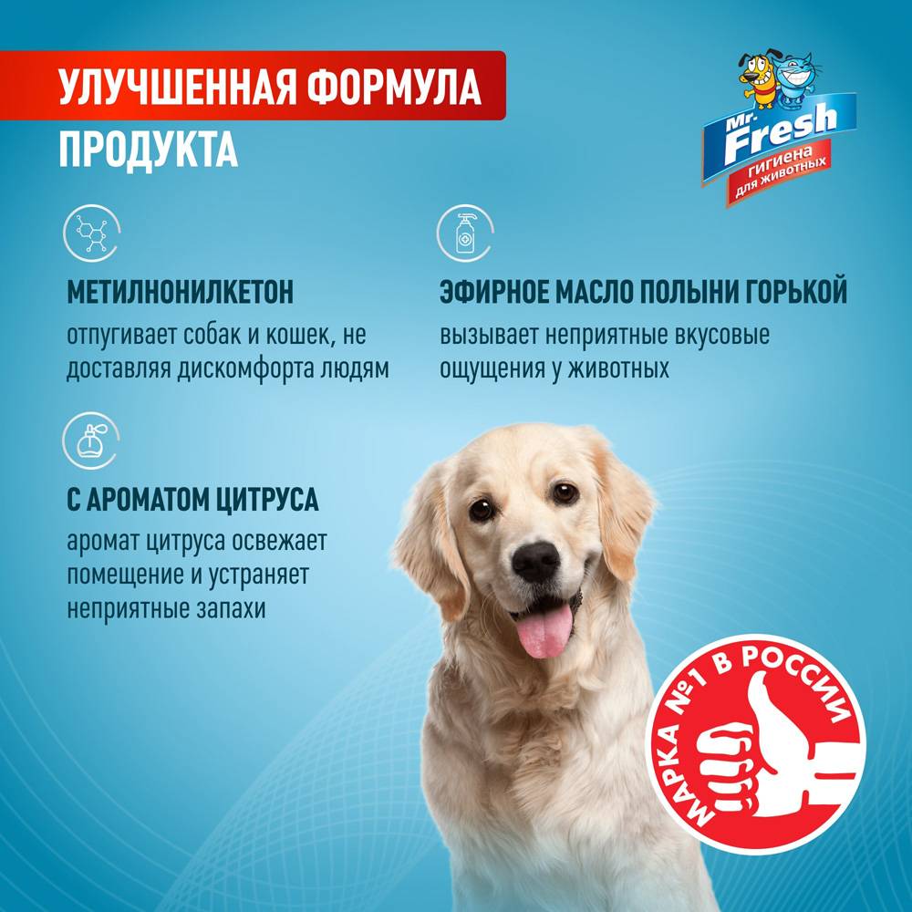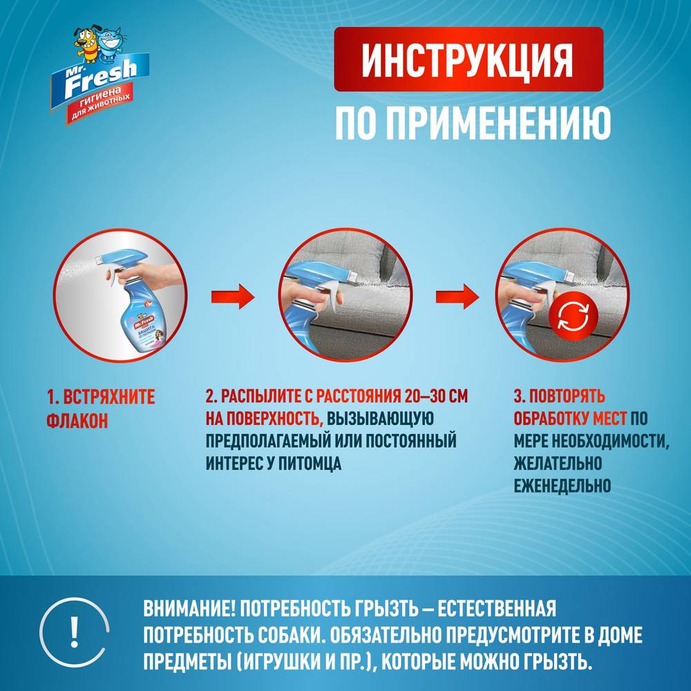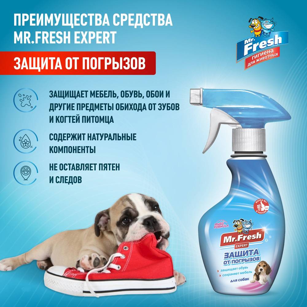 Применение средства Mr. Fresh Expert защита от погрызов для собак 200 мл снижает естественную потребность собак грызть и царапать интересующие поверхности, защищая мебель, обувь, предметы обихода от зубов и когтей питомца.
