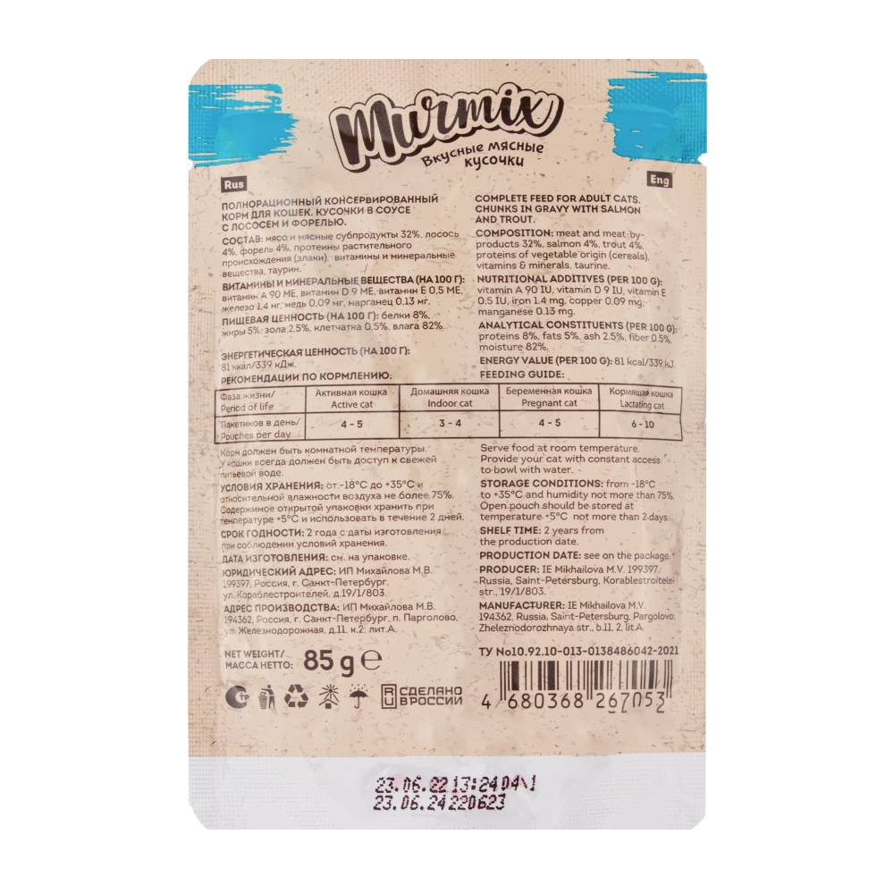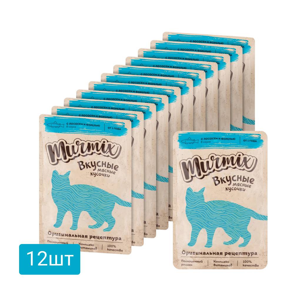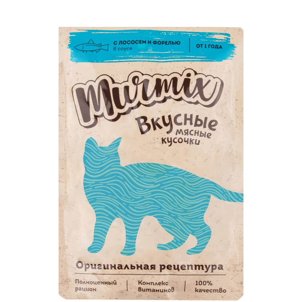 Murmix Влажный корм (пауч) для взрослых кошек, кусочки лосося с форелью в соусе, 85 гр.