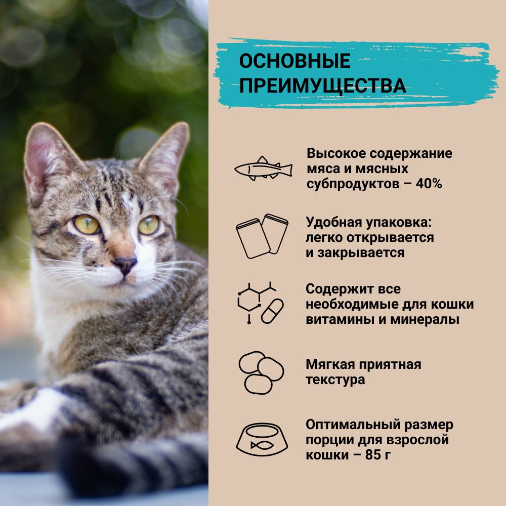 • Порция в 85 гр - рекомендуемая норма для разового приема пищи взрослой кошки среднего размера;