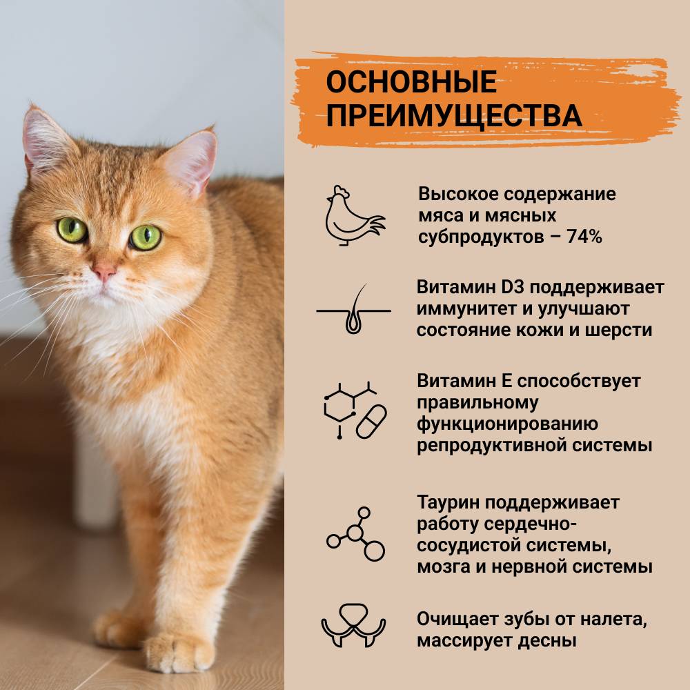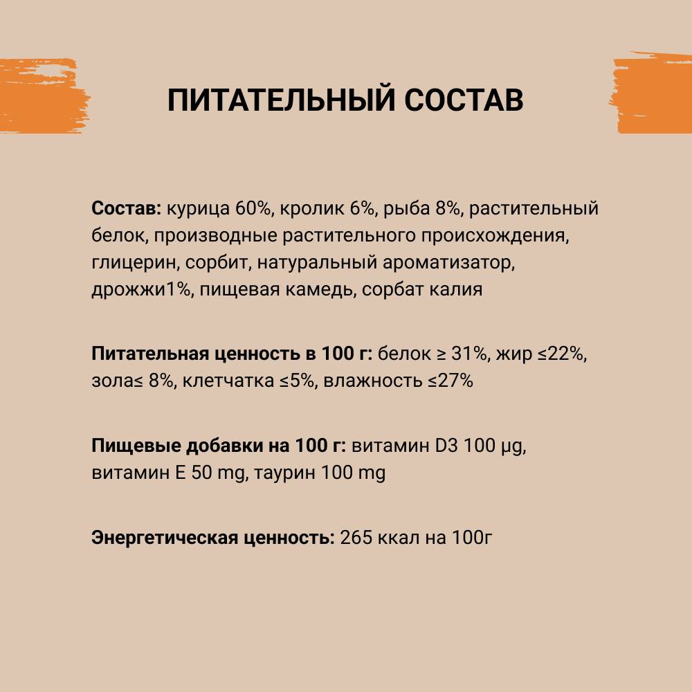 Сочетание нескольких сортов мяса, дополненное рыбой, делает вкус непревзойденным! Попробовав однажды, питомец всегда будет распознавать его среди других и с радостью попытается угодить Вам, лишь бы получить любимое угощение.