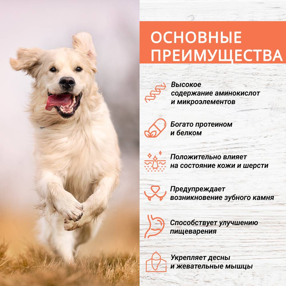 - Состоит из соединительной ткани, богато протеином, а высокое содержание белка положительно влияет на состояние кожи и шерсти собаки.
