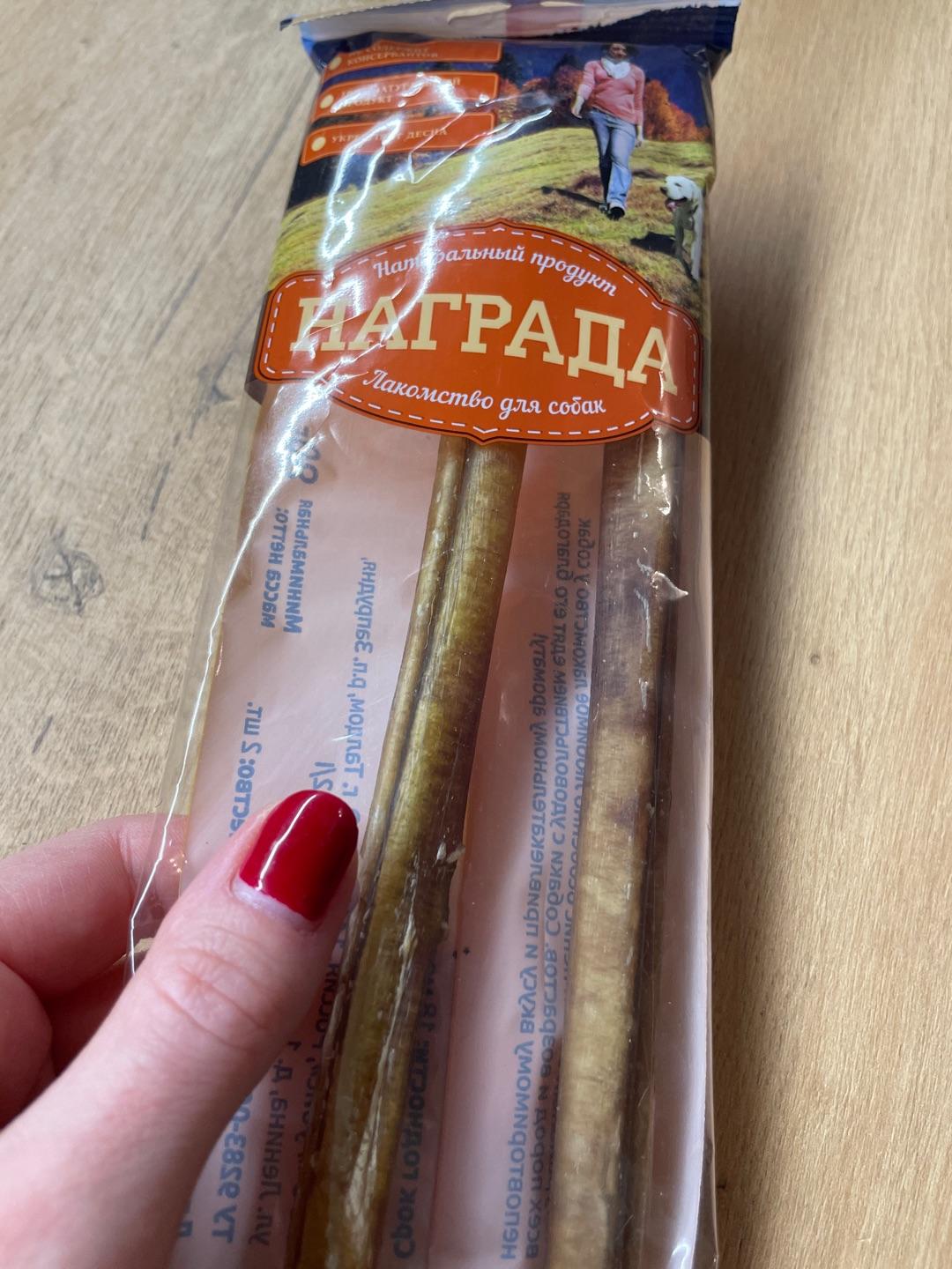 Это самое лучшее, натуральное и самое любимое лакомство нашей булочки. Фирма награда выпускает хороший товар. Брала других фирм и собака съедала 30см за 15 мин. Т.к он внутри был пустой. Наша булочка за год уже штук 15 слопал и конечно будет еще. Рекомендую!
