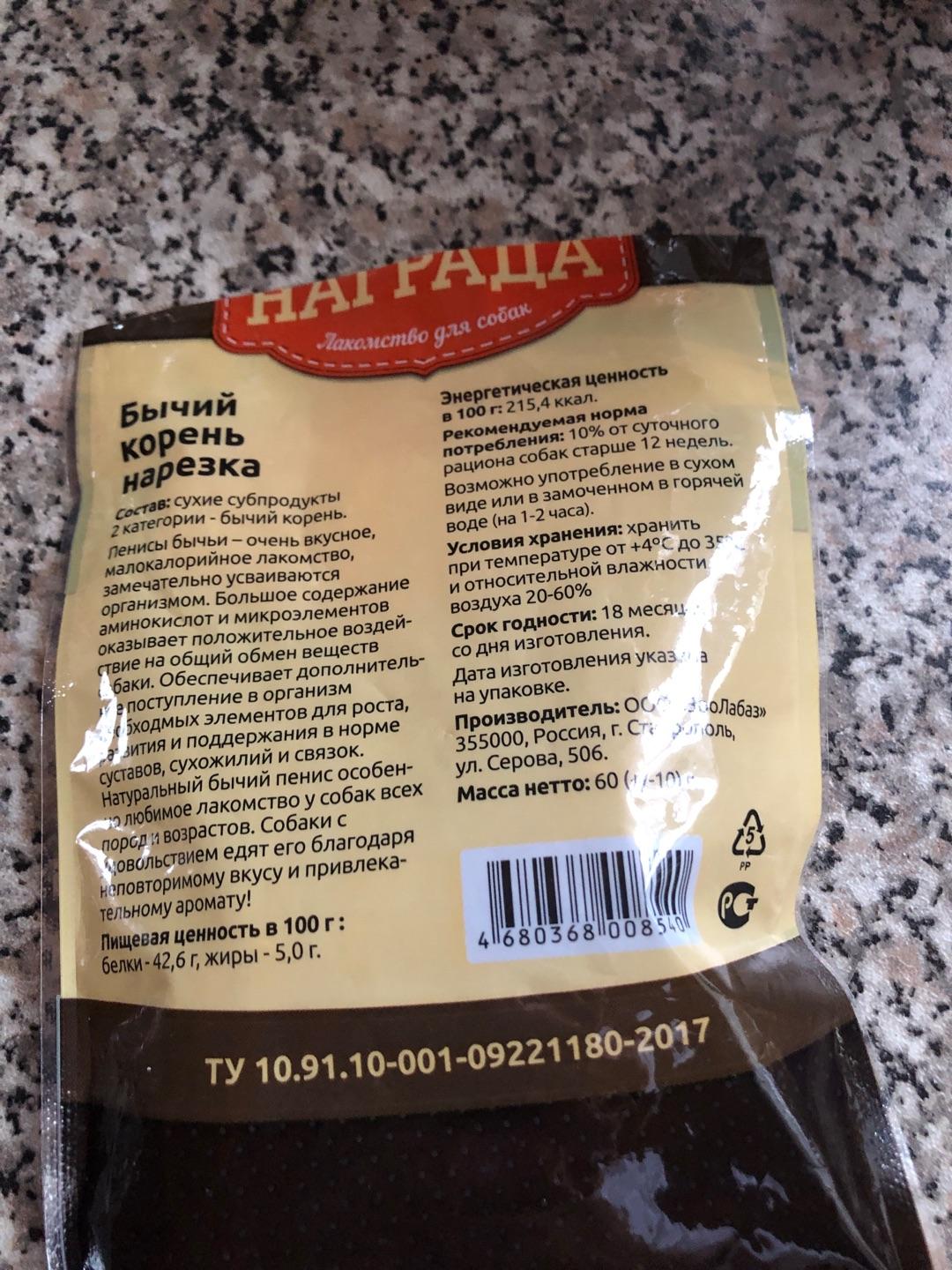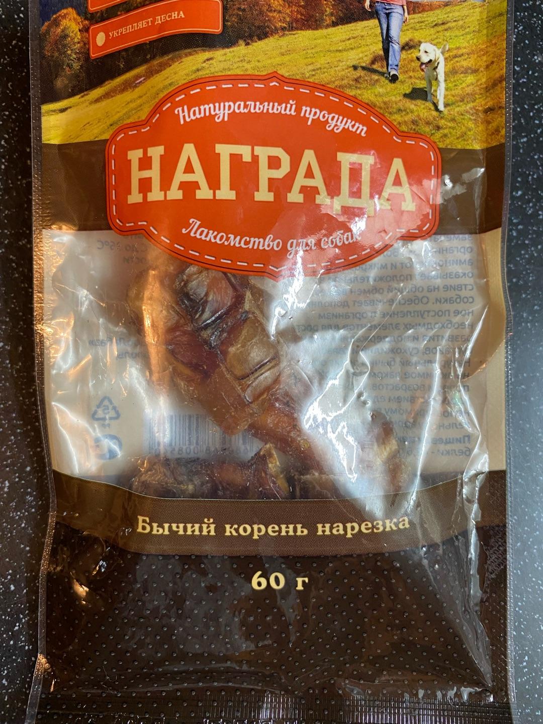 Кавалер Кинг Чарльз спаниель с удовольствием грызет бычий корень. Всё остальное ленится или не хочет грызть. А надо, в частности для зубов, предотвратить образование зубного камня. Удобная нарезка. Попробовали и другие вкусняшки торговой марки Награда -понравились, так, например, наггетсы из индейки.Комментарий