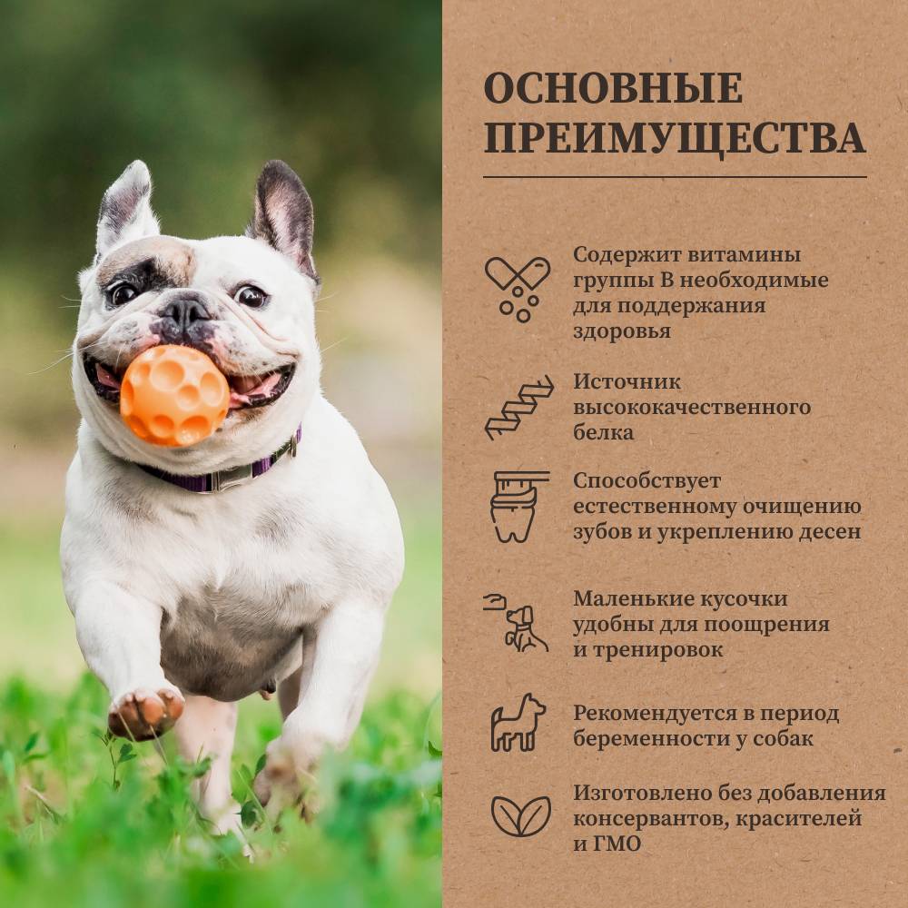 Лакомство является натуральным источником витамина В2, витамина РР, фосфора, железа, калия. Содержит коллаген и эластин, которые отвечают за здоровье суставов, связок, кожи и шерсти.