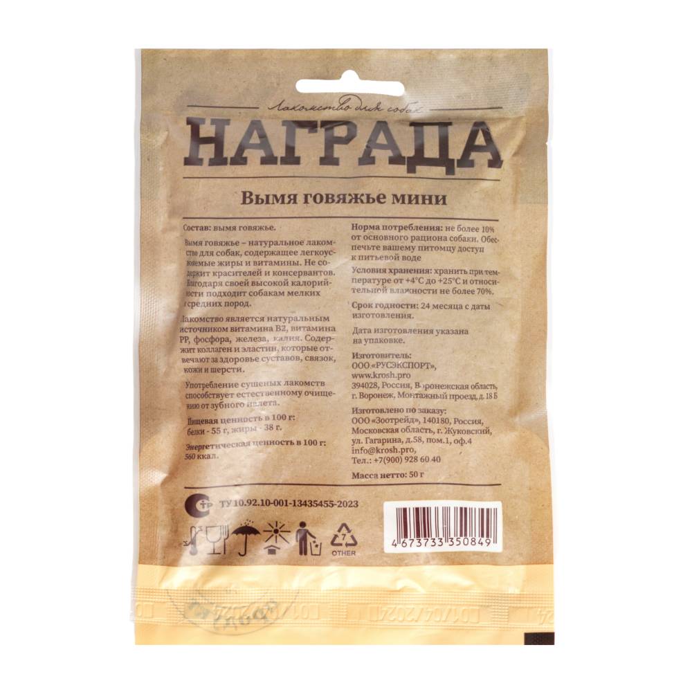 Награда Вымя говяжье - натуральное лакомство для собак, содержащее легкоусвояемые жиры и витамины. Благодаря своей высокой калорийности подходит собакам мелких и средних пород.