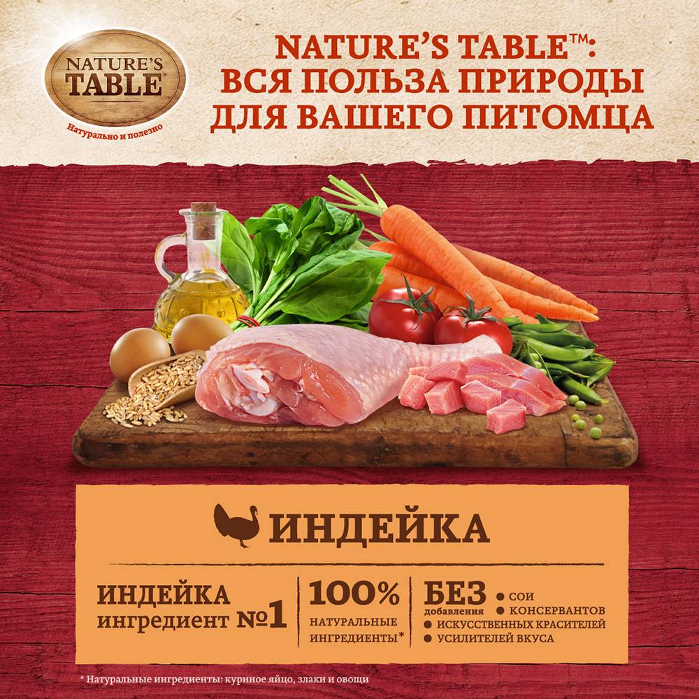 Nature’s Table™. Натурально и полезно! Рацион Nature’s Table Индейка содержит 100% натуральные ингредиенты высокого качества, получаемые от проверенных поставщиков: - ингредиент №1 – индейка – источник животного белка с высокой усвояемостью, диетическое мясо; - подсолнечное масло и рыбий жир – для здоровья кожи и блестящей шерсти; - натуральные овощи и злаки – содержат легкоусвояемые углеводы, минералы и витамины группы В для здорового пищеварения, поддержания микрофлоры кишечника и высокого уровня активности вашей кошки; - БЕЗ сои, искусственных красителей, усилителей вкуса и консервантов. Nature’s Table – вся польза природы для вашей кошки, чтобы она радовала вас здоровьем и красотой день за днем!
