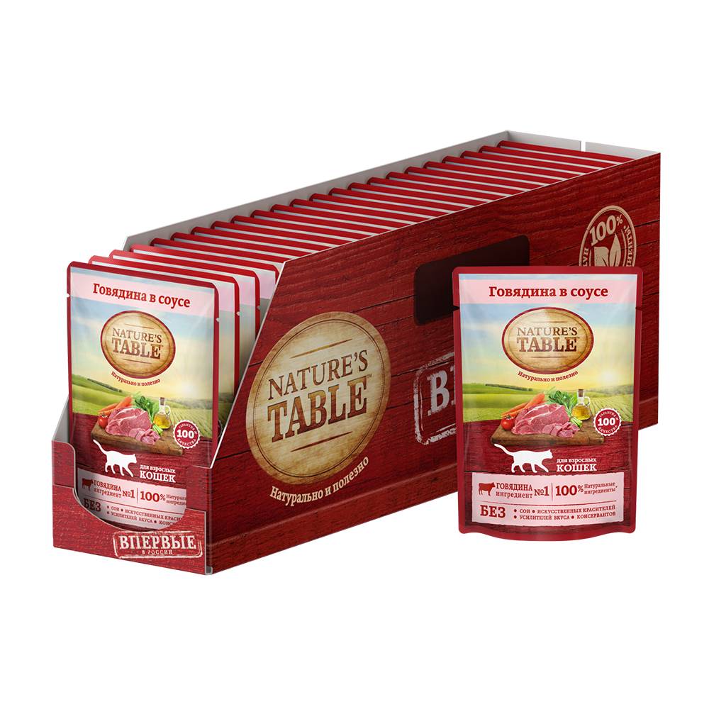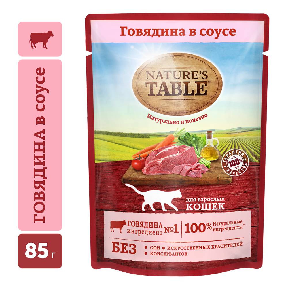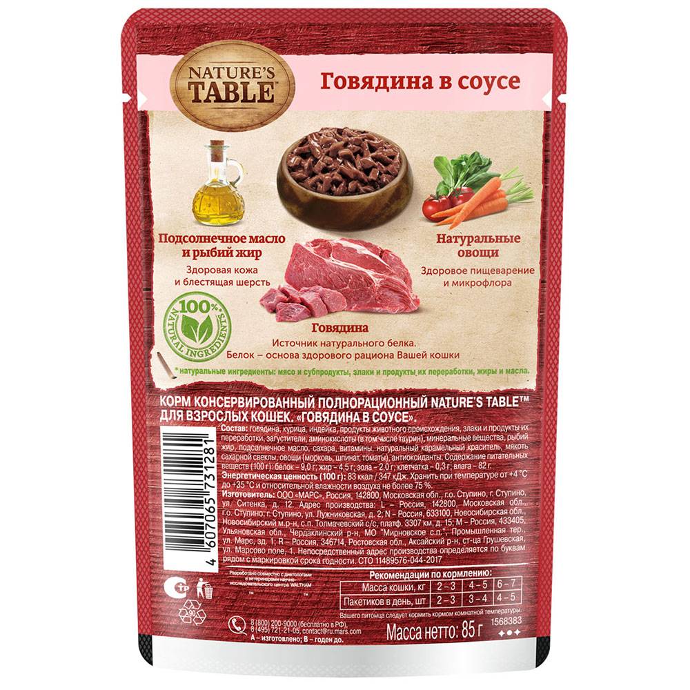Nature’s Table™. Натурально и полезно! Рацион Nature’s Table Говядина в соусе содержит на 100% натуральные ингредиенты самого высокого качества, получаемые от проверенных поставщиков: - ингредиент № 1 – говядина – богатый источник белка и железа, а также незаменимых аминокислот, что является основой здорового рациона кошки и главным источником ее энергии и сил; - натуральные овощи: мякоть сахарной свеклы, морковь, шпинат и другие содержат пищевые волокна для улучшения пищеварения и поддержания микрофлоры; - подсолнечное масло и рыбий жир – источники омега-3 и омега-6 кислот, витаминов А, D, E для естественного здоровья кожи и блестящей шерсти; - БЕЗ сои, искусственных красителей, усилителей вкуса и консервантов. Nature’s Table – вся польза природы для вашей кошки, чтобы она радовала вас здоровьем и красотой день за днем!